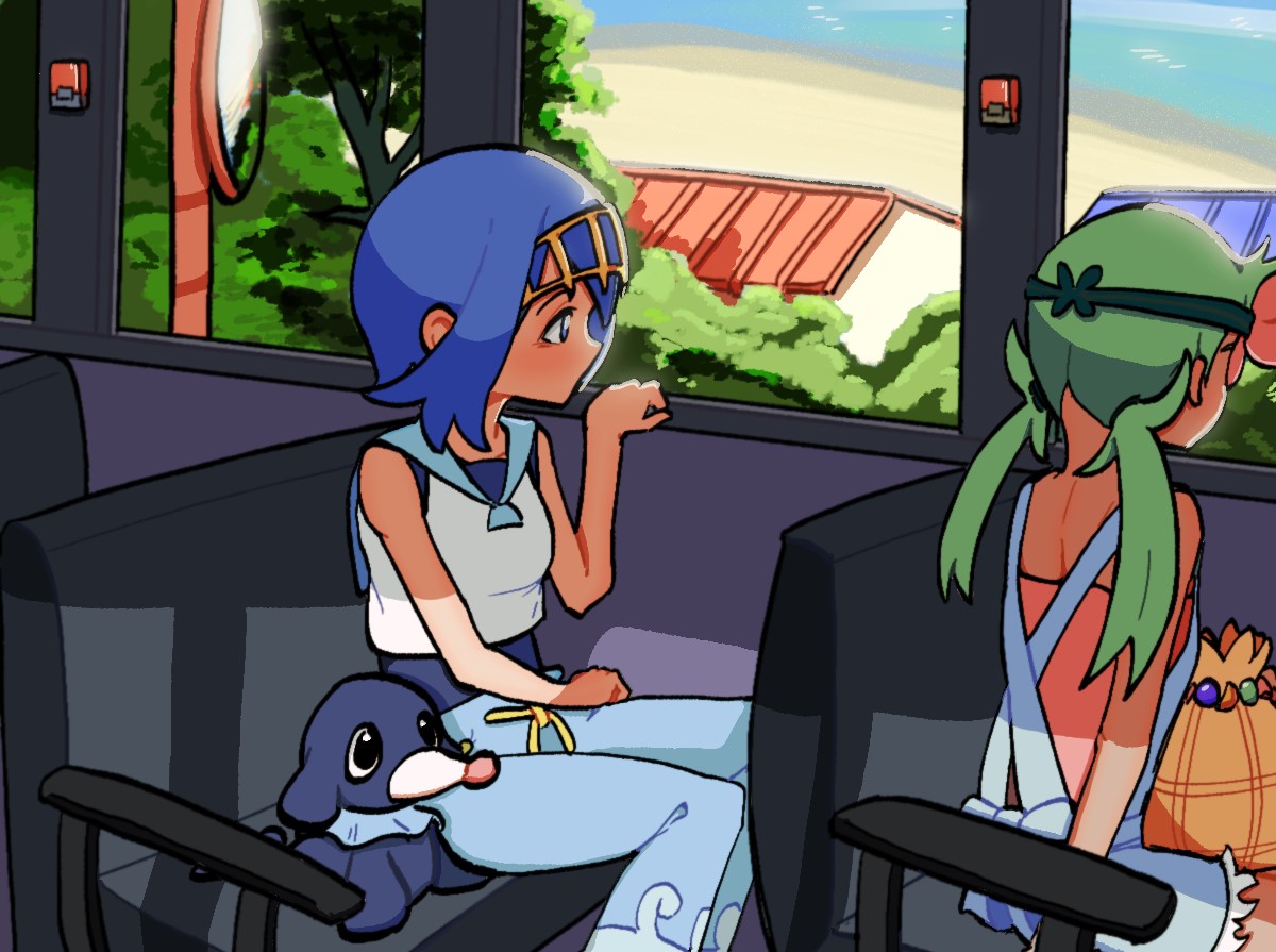 2049_(hh5566) 2girls backless_shirt bare_shoulders black_hair blue_eyes bob_cut breasts dark-skinned_female dark_skin flower flower_on_head gen_7_pokemon green_hair lana_(pokemon) long_hair looking_afar looking_to_the_side low_twintails mallow_(pokemon) medium_hair multiple_girls nintendo one-piece_swimsuit overalls pants pokemon pokemon_sun_and_moon popplio shirt sidelocks sitting sleeveless sleeveless_shirt small_breasts swimsuit swimsuit_under_clothes twintails vehicle_interior