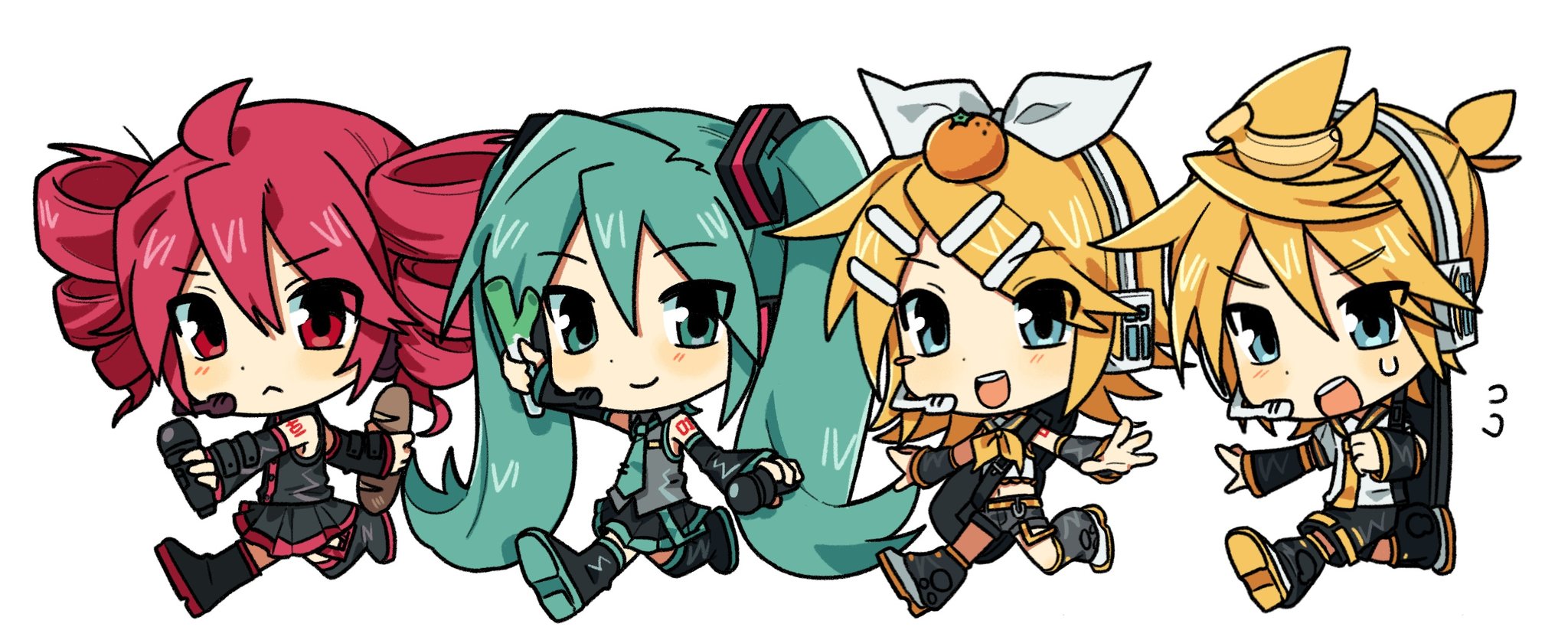 1boy 3girls :< :d ahoge aqua_eyes aqua_hair aqua_necktie arm_warmers banana black_arm_warmers black_footwear black_sailor_collar black_shirt black_shorts black_skirt blonde_hair blue_eyes blush boots bow bread chibi collared_shirt commentary_request cropped_shirt double-parted_bangs dress_shirt drill_hair food food_on_head fruit full_body gagwan grey_shirt hair_between_eyes hair_bow hatsune_miku highres holding holding_food kagamine_len kagamine_rin kasane_teto kasane_teto_(utau) korean_commentary loaf_of_bread long_hair looking_at_viewer medium_hair microphone midriff multiple_girls navel neckerchief necktie object_on_head open_mouth orange_(fruit) outstretched_arms parted_bangs pleated_skirt red_eyes red_hair running sailor_collar shirt short_shorts shorts sidelocks simple_background skirt sleeveless sleeveless_shirt smile spring_onion teeth twin_drills twintails upper_teeth_only utau vocaloid white_background white_bow white_shirt yellow_neckerchief yellow_necktie