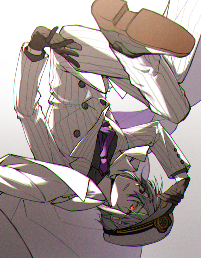1boy black_shirt brown_gloves coat coat_on_shoulders collared_shirt gloves grey_hair hand_on_own_hat hat heterochromia jacket looking_at_viewer mahoutsukai_no_yakusoku moro_(from_m0r0) necktie owen_(mahoutsukai_no_yakusoku) pants purple_necktie red_eyes shirt shoes solo upside-down white_coat white_hat white_jacket white_pants yellow_eyes
