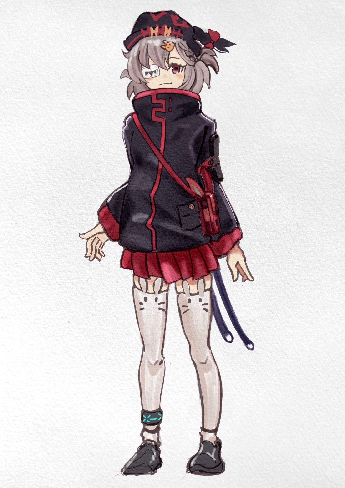 1girl animal_ears arknights black_jacket eyepatch grey_hair hair_ornament hat highres hood jacket long_hair long_sleeves looking_at_viewer ma_tsun_3578 popukar_(arknights) red_eyes short_hair simple_background skirt smile solo thighhighs x_hair_ornament