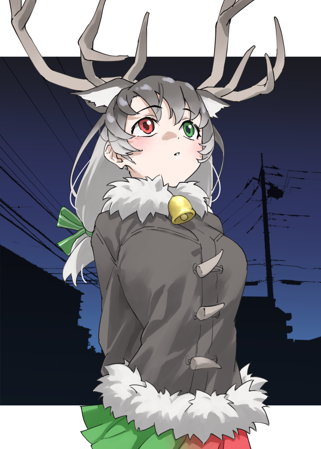 1girl animal_ears antlers arms_behind_back bell blush bow brown_hair coat commentary cowboy_shot deer_ears deer_tail extra_ears fur_collar fur_trim gradient_clothes gradient_hair gradient_skirt green_bow green_eyes green_skirt grey_coat grey_hair hair_between_eyes hair_bow heterochromia highres horns kemono_friends multicolored_hair neck_bell pleated_skirt power_lines red_eyes red_skirt reindeer_(kemono_friends) reindeer_antlers reindeer_girl sidelocks skirt solo tail tanabe_(fueisei) twintails white_fur winter_clothes winter_coat