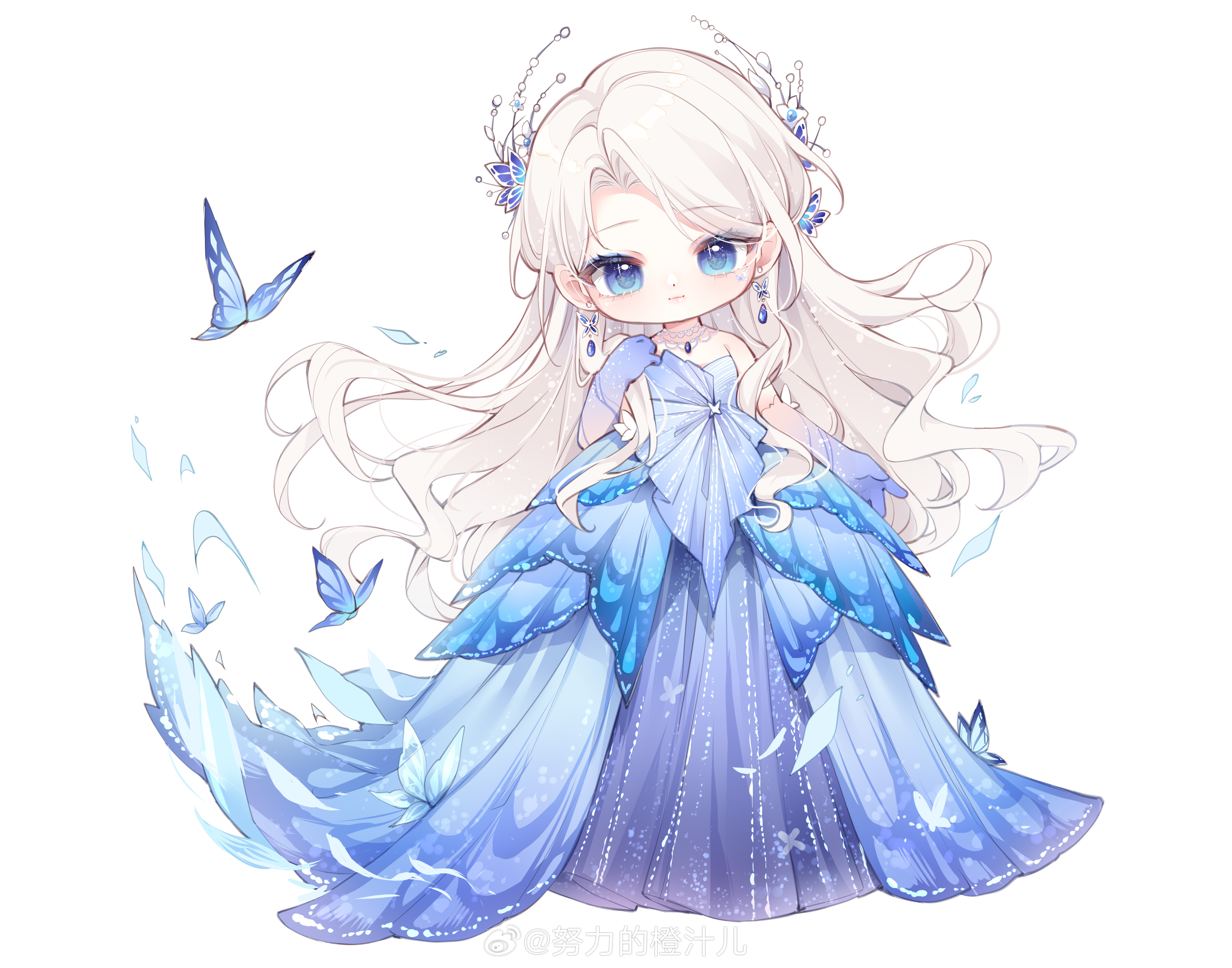 1girl absurdres animal_print bare_shoulders blue_butterfly blue_dress blue_eyes blue_eyeshadow blue_gloves bug butterfly butterfly_hair_ornament butterfly_print butterfly_tattoo chibi chinese_commentary circlet closed_mouth commentary_request dot_nose dress earrings expressionless eyelashes eyeshadow facial_tattoo flower flutter_storm_(infinity_nikki) gloves gown hair_flower hair_ornament hand_on_own_shoulder highres infinity_nikki insect jewelry light_blush lipstick long_dress long_hair looking_at_viewer makeup necklace nikki_(series) nuli_de_chengzhi_er pink_lips sidelocks simple_background solo standing strapless strapless_dress tattoo very_long_hair watermark wavy_hair weibo_watermark white_background white_flower white_hair