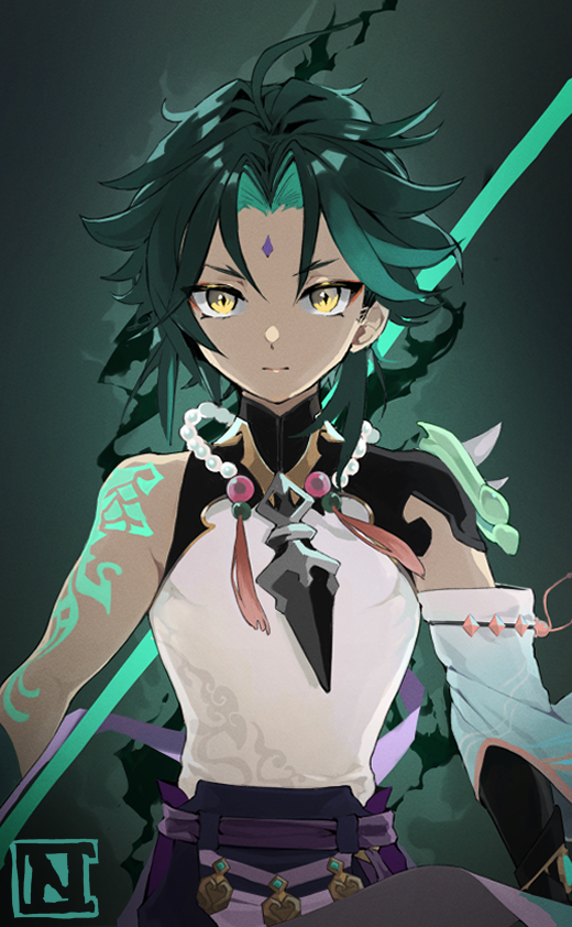 1boy arm_tattoo bead_necklace beads black_hair choco_c14 closed_mouth detached_sleeves eyeliner facial_mark forehead_mark genshin_impact gloves green_hair jewelry looking_at_viewer makeup male_focus multicolored_hair necklace polearm red_eyeliner signature simple_background single_detached_sleeve solo tassel tattoo upper_body weapon xiao_(genshin_impact) yellow_eyes