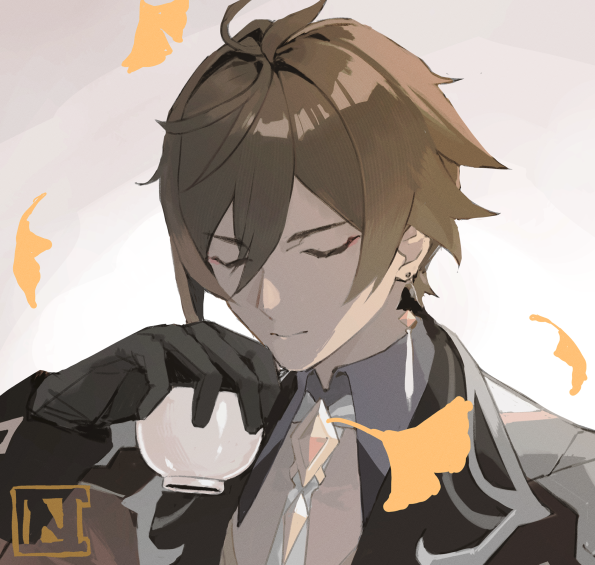 1boy black_gloves brown_hair choco_c14 closed_eyes closed_mouth coat collared_shirt commentary cup earrings genshin_impact gloves hair_between_eyes holding holding_cup jewelry leaf long_sleeves male_focus necktie shirt signature simple_background single_earring solo untranslatable_commentary upper_body zhongli_(genshin_impact)