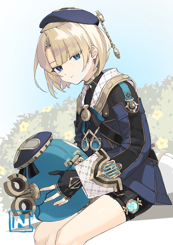 1boy black_gloves black_hat black_shorts blonde_hair blue_eyes bush choco_c14 commentary_request flower freckles freminet_(genshin_impact) genshin_impact gloves hair_between_eyes hat holding jacket long_sleeves looking_at_viewer male_focus parted_lips partially_fingerless_gloves short_shorts shorts signature sitting solo thelxie_(genshin_impact) yellow_flower