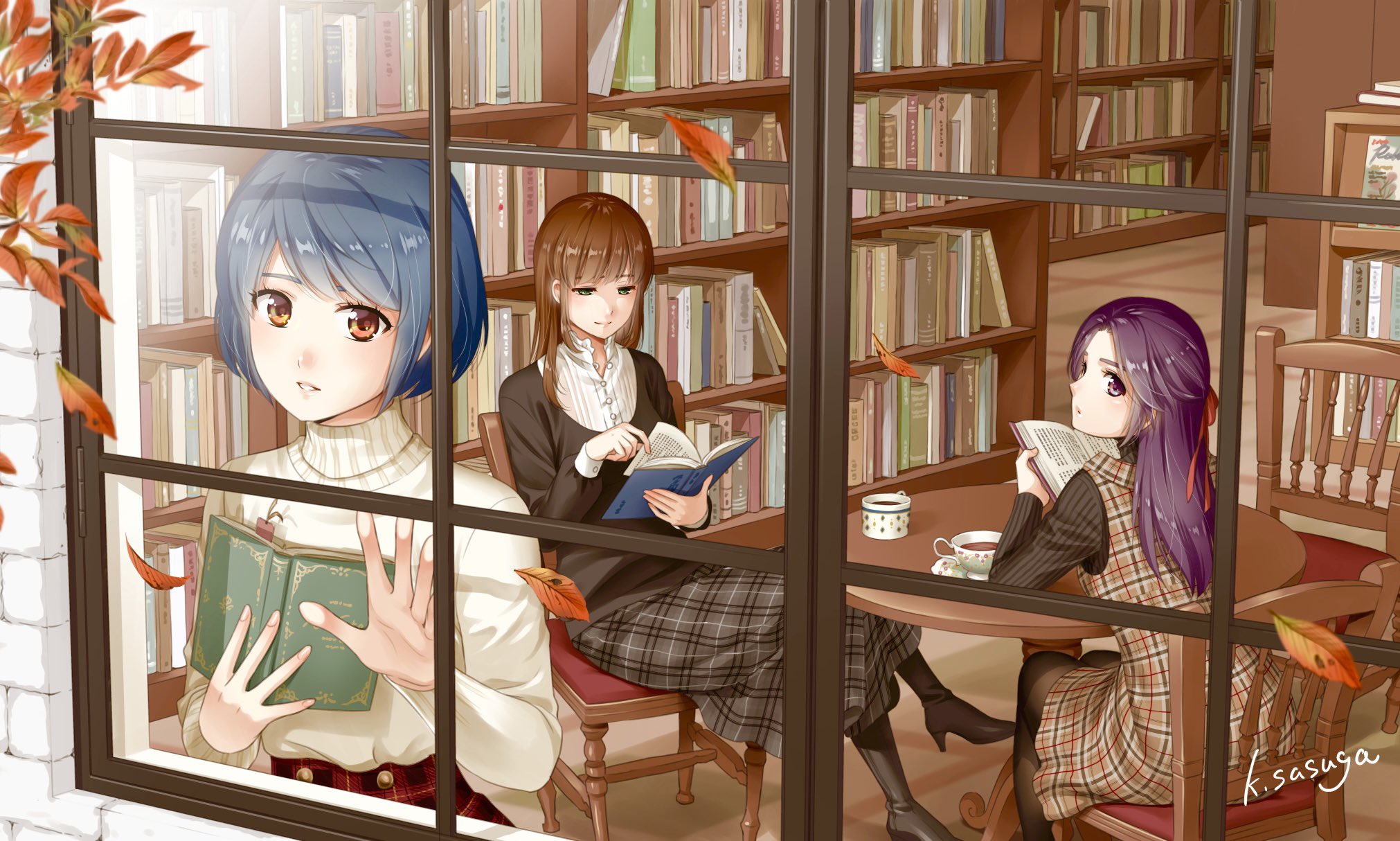 3girls autumn autumn_leaves blouse blue_hair book bookshelf boots brick_wall brown_hair carpet commentary_request cup domestic_na_kanojo green_eyes hand_up high_heel_boots high_heels highres leaf library long_hair looking_at_viewer magazine_(object) multiple_girls official_art purple_eyes purple_hair red_eyes red_ribbon revision ribbon sasuga_kei serizawa_miyabi shirt short_hair signature skirt sweater table tachibana_hina tachibana_rui tea teacup turtleneck turtleneck_sweater window