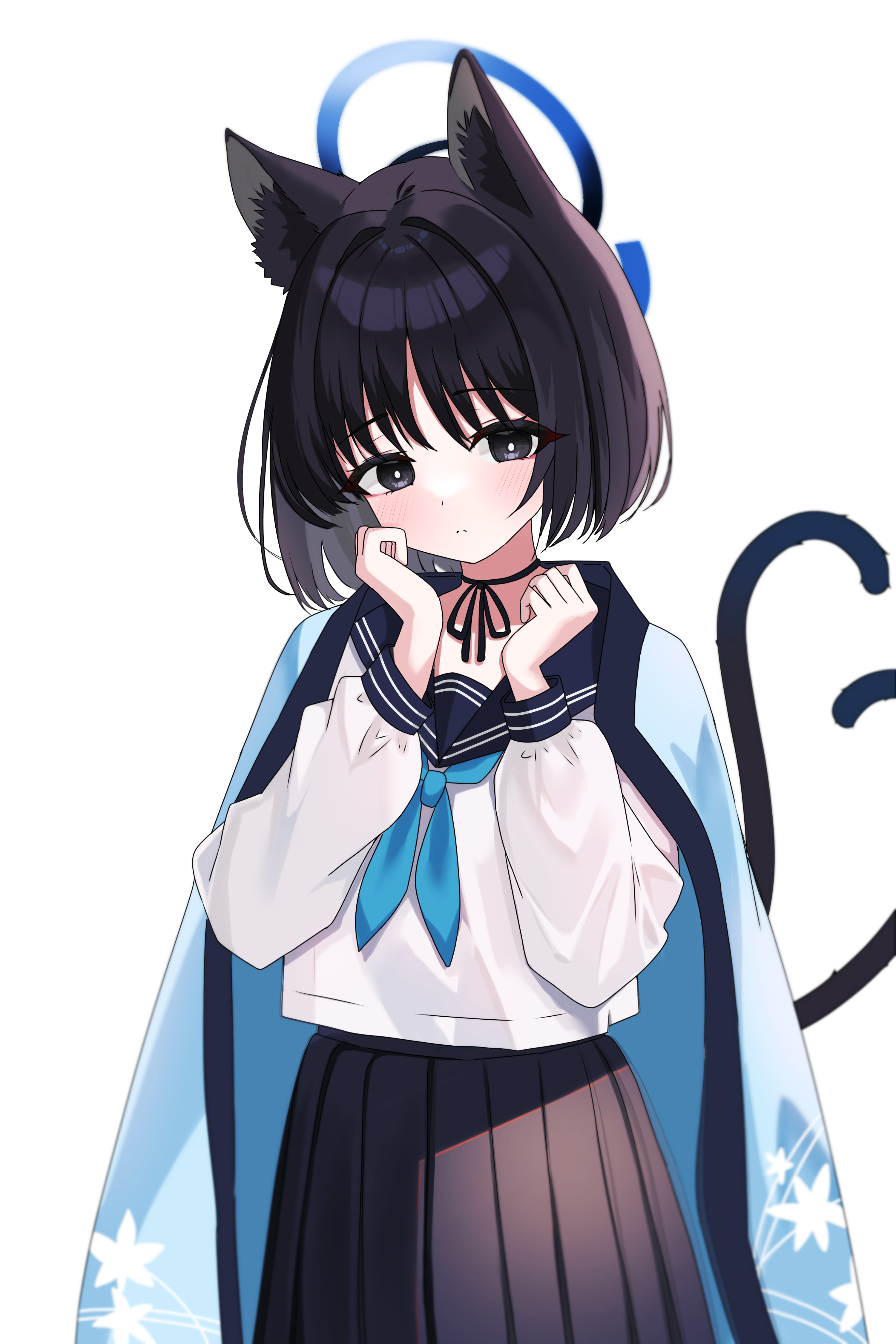 1girl absurdres animal_ear_fluff animal_ears aqua_cape black_eyes black_hair black_ribbon black_skirt blue_archive blue_halo blue_neckerchief cape cat_ears cat_girl cat_tail choker clenched_hands closed_mouth commentary_request dot_nose drawing_flover halo highres kikyou_(blue_archive) light_frown long_sleeves multiple_tails neckerchief ribbon ribbon_choker school_uniform serafuku shirt short_hair simple_background skirt solo tail two_tails white_background white_serafuku white_shirt