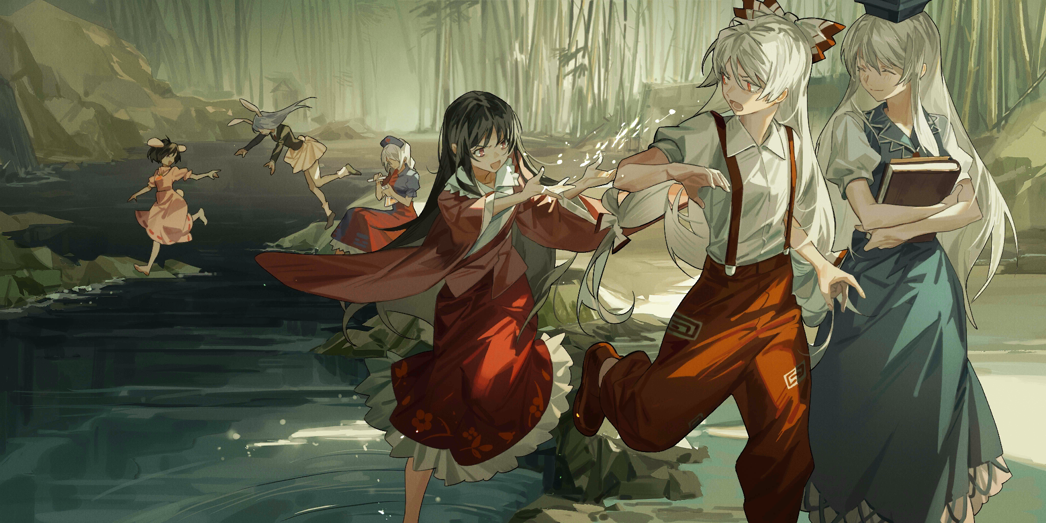 6+girls :d ^_^ animal_ears bamboo bamboo_forest barefoot black_hair black_jacket blazer blue_dress blue_hat book bow carrot_necklace closed_eyes closed_mouth collared_shirt dress erlenmeyer_flask flask forest fujiwara_no_mokou game_cg hair_bow hat highres holding holding_book holding_flask holding_test_tube houraisan_kaguya huang_gua inaba_tewi jacket jewelry kamishirasawa_keine long_hair long_sleeves multiple_girls nature necklace nurse_cap official_art ofuda ofuda_on_clothes open_mouth pants pink_dress pink_shirt pink_skirt puffy_short_sleeves puffy_sleeves purple_hair rabbit_ears rabbit_tail red_dress red_eyes red_footwear red_pants red_skirt reisen_udongein_inaba ribbon-trimmed_dress ribbon_trim river shirt short_hair short_sleeves sitting skirt smile socks splashing suspenders tail test_tube third-party_source touhou touhou_lostword trigram two-tone_dress very_long_hair water white_bow white_hair white_shirt white_socks wide_sleeves yagokoro_eirin