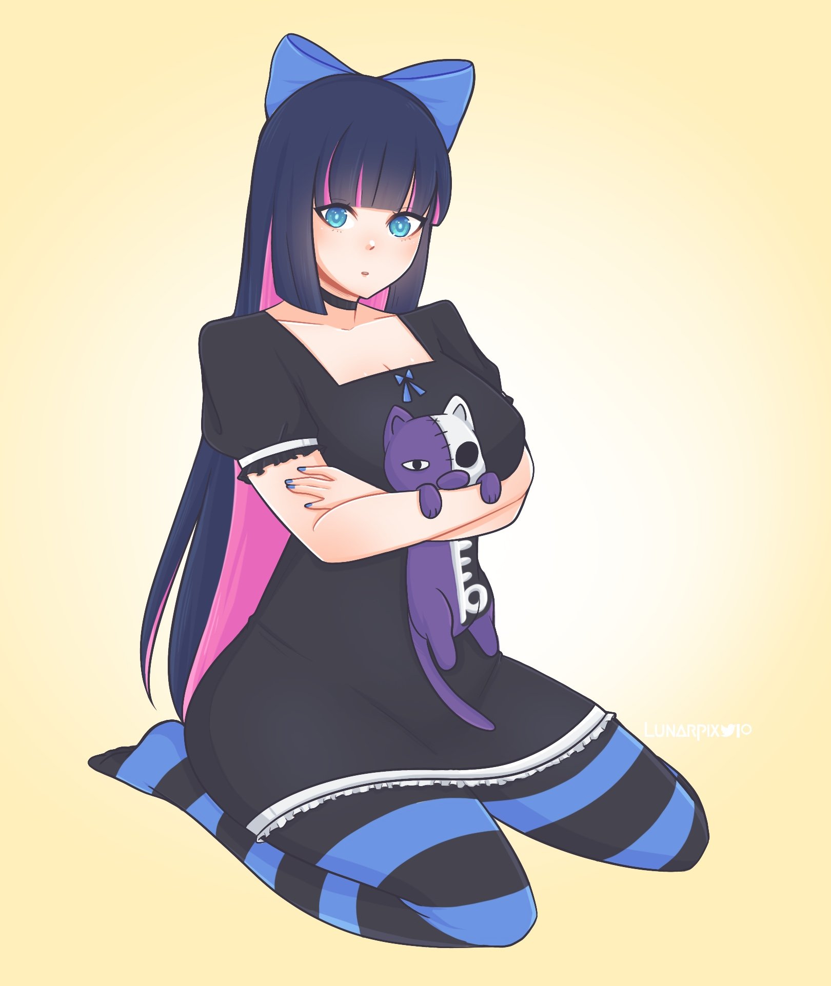 1girl artist_name commentary english_commentary highres honekoneko_(psg) lunarpix_(artist) panty_&_stocking_with_garterbelt stocking_(psg) striped_clothes striped_thighhighs stuffed_animal stuffed_cat stuffed_toy thighhighs