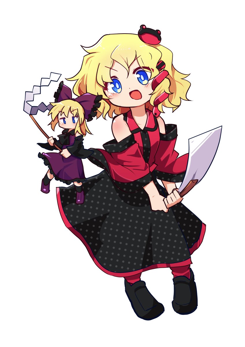 2girls adapted_costume alternate_costume ascot bare_shoulders black_ascot black_skirt blonde_hair blue_eyes bow cosplay detached_sleeves frilled_bow frills frog_hair_ornament full_body gohei hair_ornament hair_tubes hairband hakurei_reimu hakurei_reimu_(cosplay) highres holding holding_gohei japanese_clothes kanisawa_yuuki kochiya_sanae kochiya_sanae_(cosplay) kochiya_sanae_(human-deity_duality) medicine_melancholy multiple_girls nontraditional_miko open_mouth purple_ribbon purple_shirt purple_skirt ribbon shirt short_hair simple_background skirt snake_hair_ornament su-san touhou white_background wide_sleeves