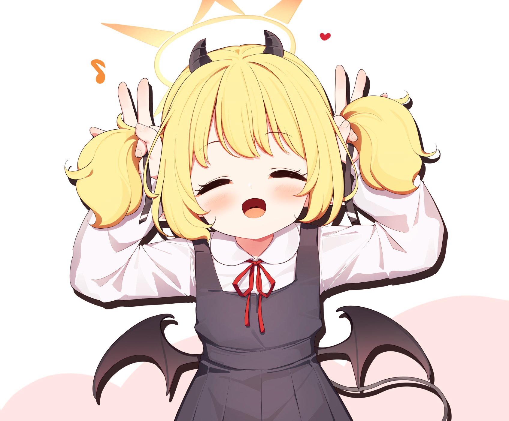 1girl arms_up black_horns black_ribbon black_tail black_wings blonde_hair blue_archive blue_dress blush bunching_hair closed_eyes collared_shirt commentary_request demon_girl demon_horns demon_tail demon_wings dress drop_shadow eighth_note facing_viewer hair_ribbon halo heart highres horns ibuki_(blue_archive) long_hair long_sleeves low_wings musical_note neck_ribbon open_mouth pinafore_dress pointy_ears red_ribbon ribbon setmen shirt sleeveless sleeveless_dress smile solo tail twintails upper_body white_background white_shirt wings yellow_halo