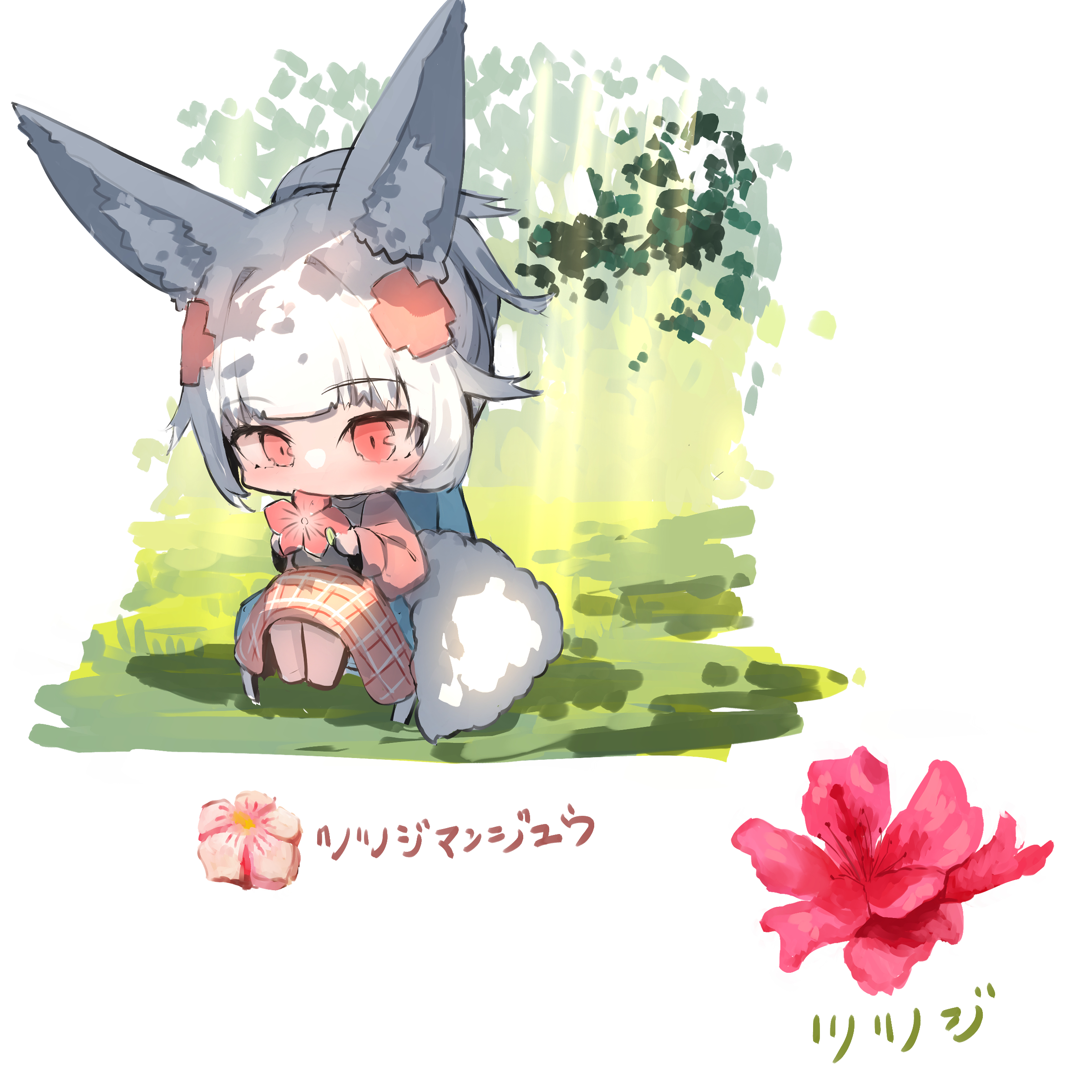 1girl absurdres animal_ear_fluff animal_ears barefoot flower fox_ears fox_girl fox_tail grass grey_hair hair_ornament highres holding holding_flower jacket long_sleeves open_clothes open_jacket original pink_flower pink_jacket ponytail puffy_long_sleeves puffy_sleeves red_eyes shirt sitting solo tail translation_request white_background white_shirt yuuji_(yukimimi)