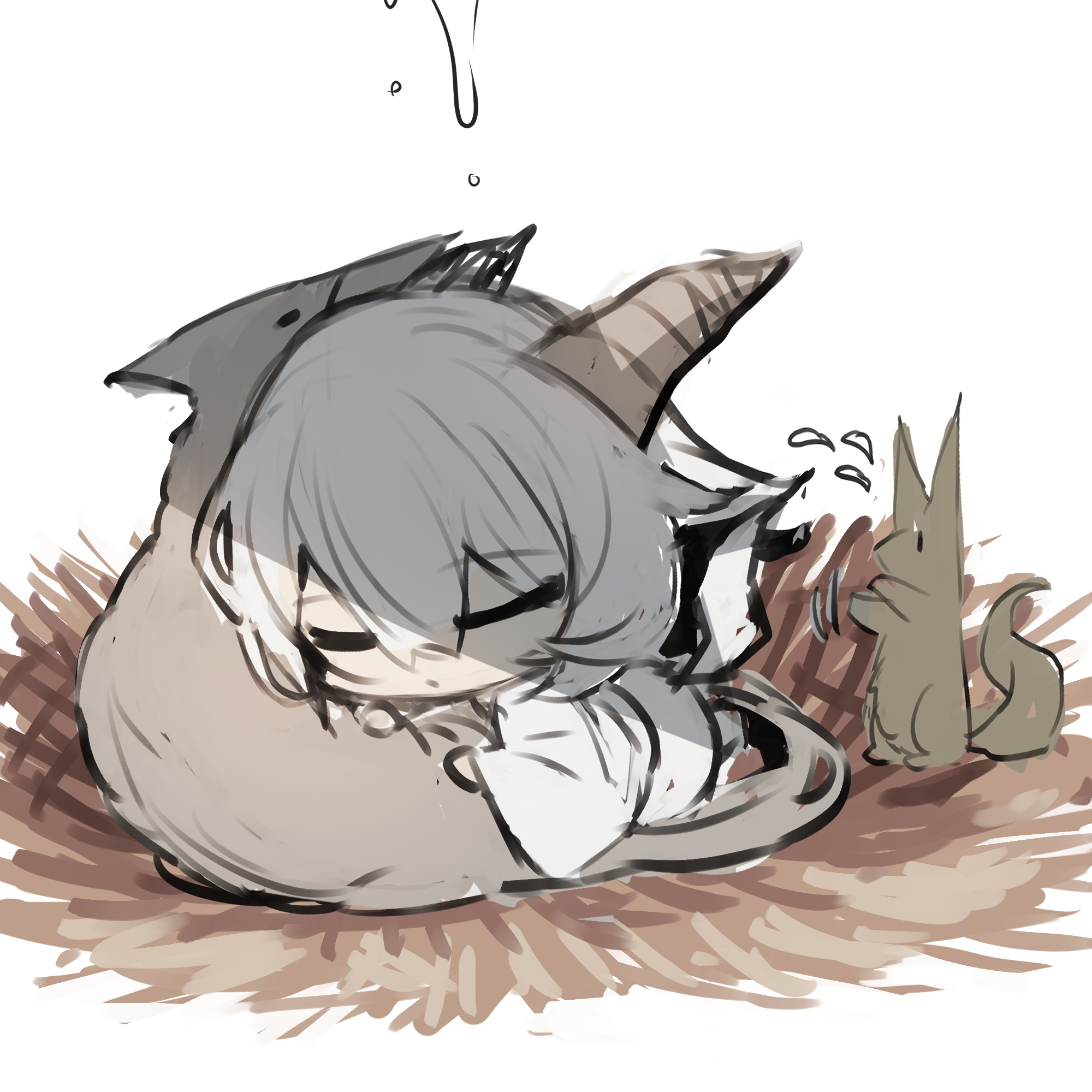 1girl animal chibi closed_eyes closed_mouth flying_sweatdrops fox hair_between_eyes highres horns japanese_clothes kimono long_sleeves original simple_background sketch sleeping solo tail water white_background white_hair white_kimono wide_sleeves yuuji_(yukimimi)