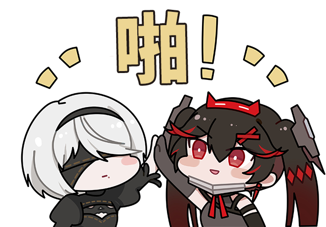 2b_(nier:automata) 2girls black_hair black_hairband black_shrug blindfold bright_pupils chibi chibi_only chinese_commentary closed_mouth commentary_request covered_eyes euyueuy fake_horns gradient_hair hair_between_eyes hair_ornament hairband high_five horn_hairband horns lucia:_dawn_(pgr) lucia_(pgr) mole mole_under_mouth multicolored_hair multiple_girls nier:automata nier_(series) open_mouth punishing:_gray_raven red_eyes red_hair red_horns short_hair shrug_(clothing) simple_background smile sticker_(medium) streaked_hair translation_request twintails upper_body voice_actor_connection white_background white_hair white_pupils x_hair_ornament