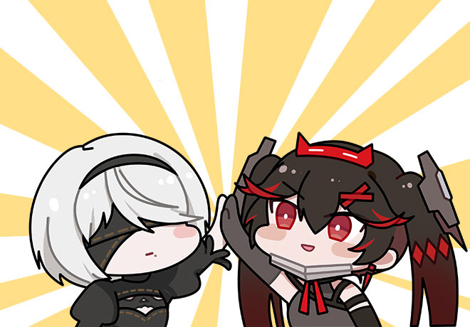 2b_(nier:automata) 2girls black_hair black_hairband black_shrug blindfold bright_pupils chibi chibi_only chinese_commentary closed_mouth commentary_request covered_eyes euyueuy fake_horns gradient_hair hair_between_eyes hair_ornament hairband high_five horn_hairband horns lucia:_dawn_(pgr) lucia_(pgr) mole mole_under_mouth multicolored_hair multiple_girls nier:automata nier_(series) open_mouth punishing:_gray_raven red_eyes red_hair red_horns short_hair shrug_(clothing) simple_background smile sticker_(medium) streaked_hair twintails upper_body voice_actor_connection white_background white_hair white_pupils x_hair_ornament