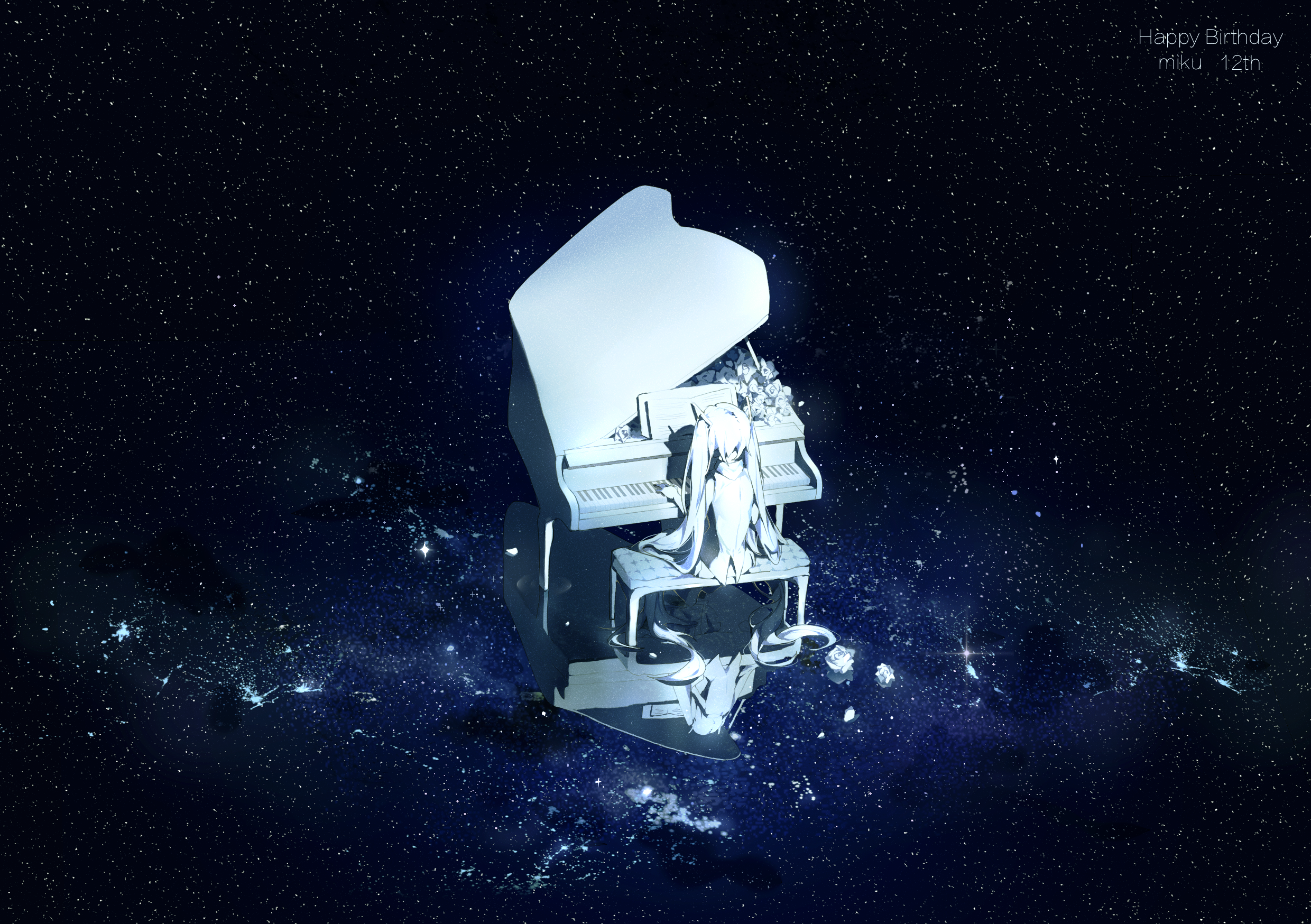 1girl absurdly_long_hair bare_shoulders blue_theme character_name chinese_commentary collared_shirt commentary_request detached_sleeves dinned english_text flower from_behind full_body grand_piano hair_ornament hair_spread_out happy_birthday hatsune_miku highres instrument long_hair long_sleeves on_stool piano reflection sheet_music shirt sitting sleeveless sleeveless_shirt solo space star_(sky) stool twintails very_long_hair vocaloid wide_sleeves
