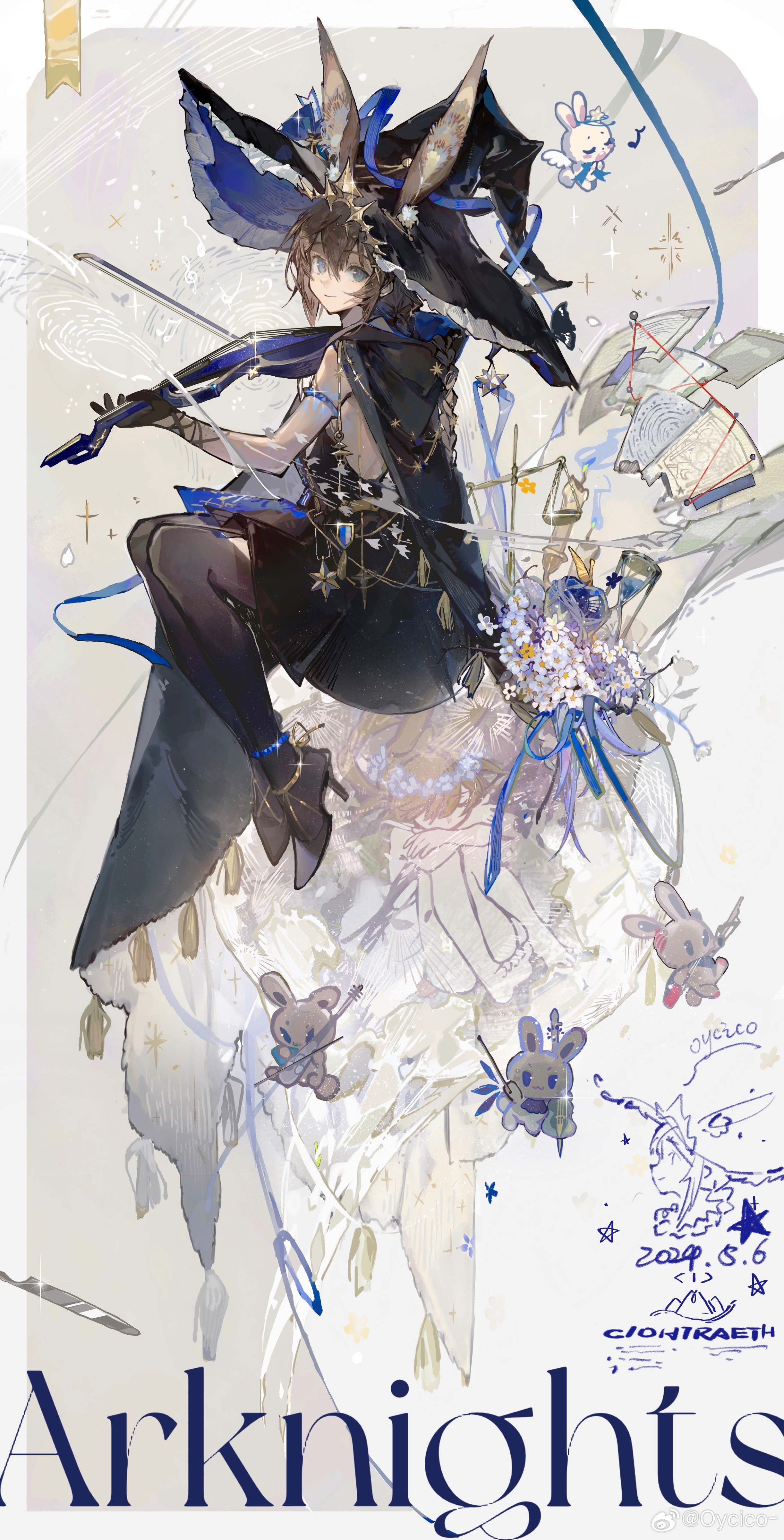 1girl absurdres amiya_(arknights) amiya_(medic)_(solo_around_the_world)_(arknights) animal_ears arknights black_dress black_gloves black_hat blue_eyes bow_(music) brown_hair commentary copyright_name dated dress ears_through_headwear frilled_hat frills gloves hat high_heels highres holding holding_instrument holding_violin instrument musical_note official_alternate_costume pantyhose qinghejunzi rabbit_ears rabbit_girl solo sparkle untranslatable_commentary two-sided_fabric two-sided_headwear violin watermark weibo_watermark witch_hat