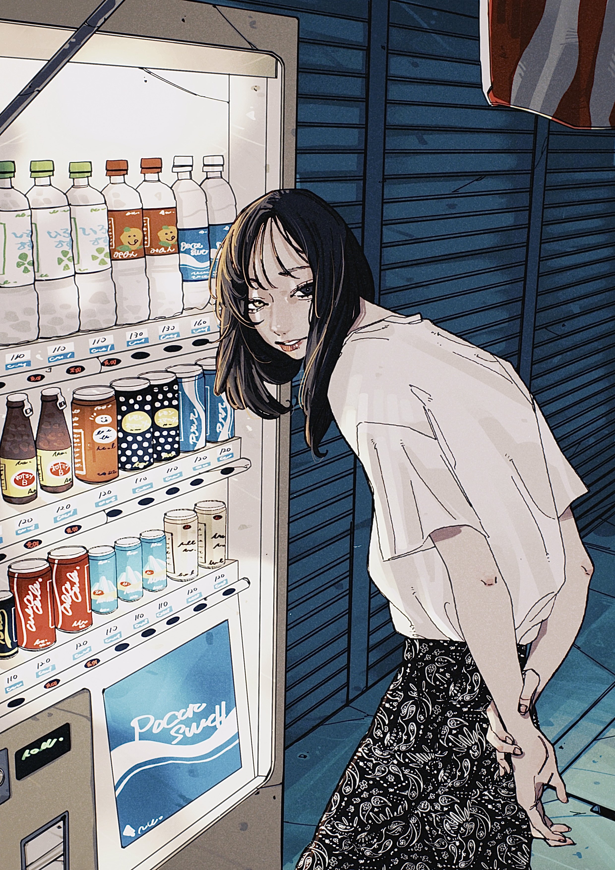1girl absurdres alley arms_behind_back bare_arms black_eyes black_hair black_skirt bottle can commentary_request cowboy_shot drink_can eyelashes fingernails floral_print hair_over_shoulder happy heterochromia highres holding_own_wrist lipstick long_hair looking_at_viewer makeup original outdoors parted_lips pink_lips salusuberi_0410 shirt short_sleeves skirt smile soda_bottle soda_can solo t-shirt thick_eyebrows vending_machine water_bottle white_eyes white_shirt