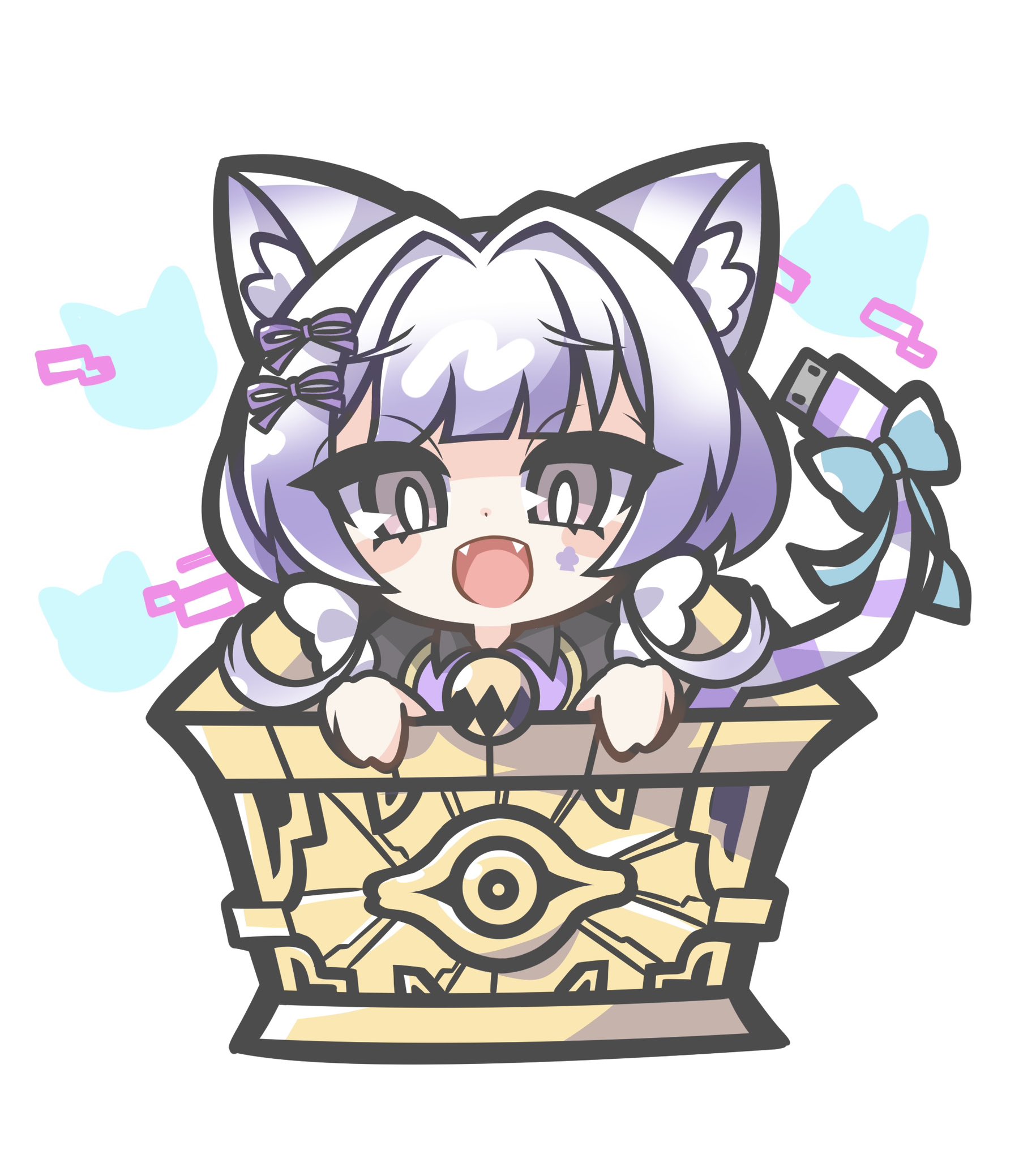 1girl animal_ear_fluff animal_ears bell blue_bow blunt_bangs bow box cable cable_tail cat_ears cat_girl cat_tail chibi club_(shape) club_facial_mark commentary duel_monster english_commentary facial_mark fangs gradient_hair grey_eyes highres in_box in_container maliss_<p>_chessy_cat mechanical_tail millennium_puzzle multicolored_hair neck_bell oquri puffy_sleeves purple_bow purple_hair purple_shirt shirt short_hair simple_background smile solo striped_tail tail tail_bow tail_ornament usb white_background white_hair white_sleeves yu-gi-oh!