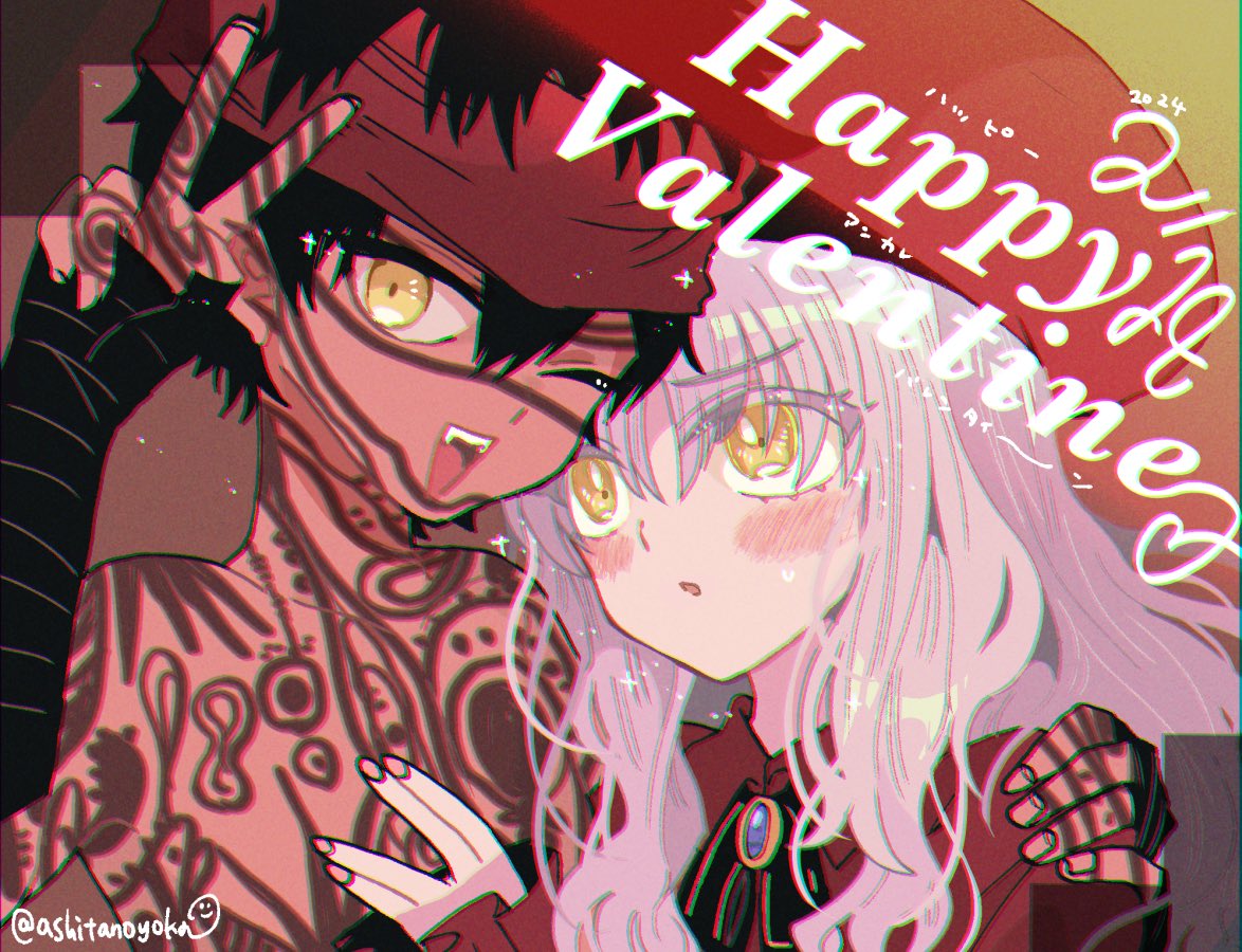 1boy 1girl 2024 ;d angra_mainyu_(fate) artist_name bandana beret black_bow black_hair blush bow bowtie caren_hortensia caren_hortensia_(amor_caren)_(second_ascension) chromatic_aberration collared_dress colored_eyelashes dark-skinned_male dark_skin dress emiya_shirou english_text eyes_visible_through_hair fangs fate/grand_order fate_(series) frilled_sleeves frills full-body_tattoo hand_on_another's_chest hand_up happy_valentine hat hetero long_hair long_sleeves looking_at_another looking_at_viewer nail_polish one_eye_closed open_mouth pink_nails possessed possession red_bandana red_dress red_hat short_hair sleeves_past_wrists smile tattoo twitter_username upper_body v white_hair wink yellow_eyes yoka