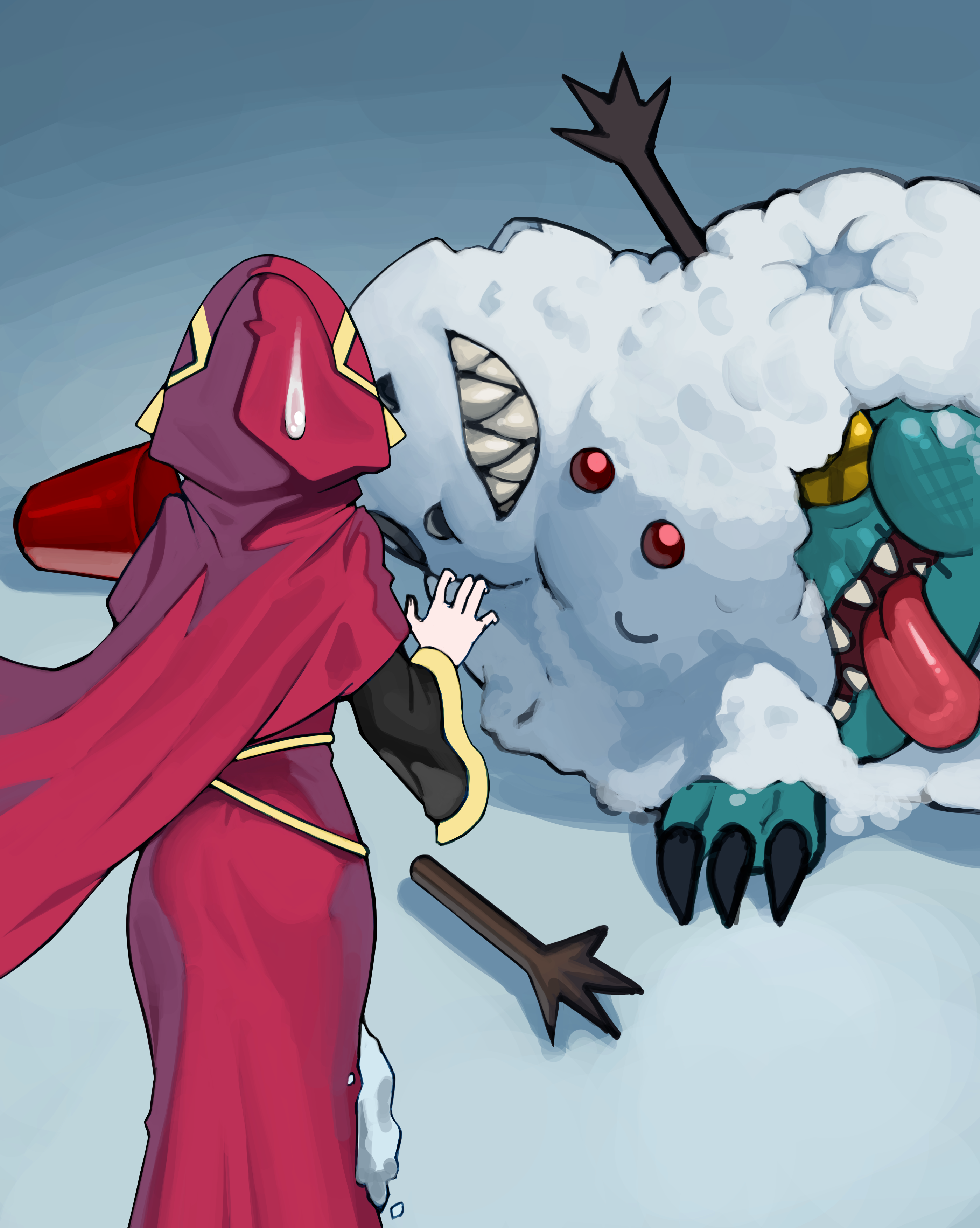 1girl absurdres black_sleeves cape claws colored_skin commentary dress duel_monster english_commentary fez_hat from_behind gold_trim gradient_background green_skin grey_background grin hat highres ibr lo_the_prayers_of_the_voiceless_voice open_mouth outstretched_hand puffy_cheeks red_cape red_dress red_hat red_hood sharp_teeth simple_background smile snowman snowman_eater stick sweatdrop teeth tongue tongue_out white_background worried x_x yellow_eyes yu-gi-oh!