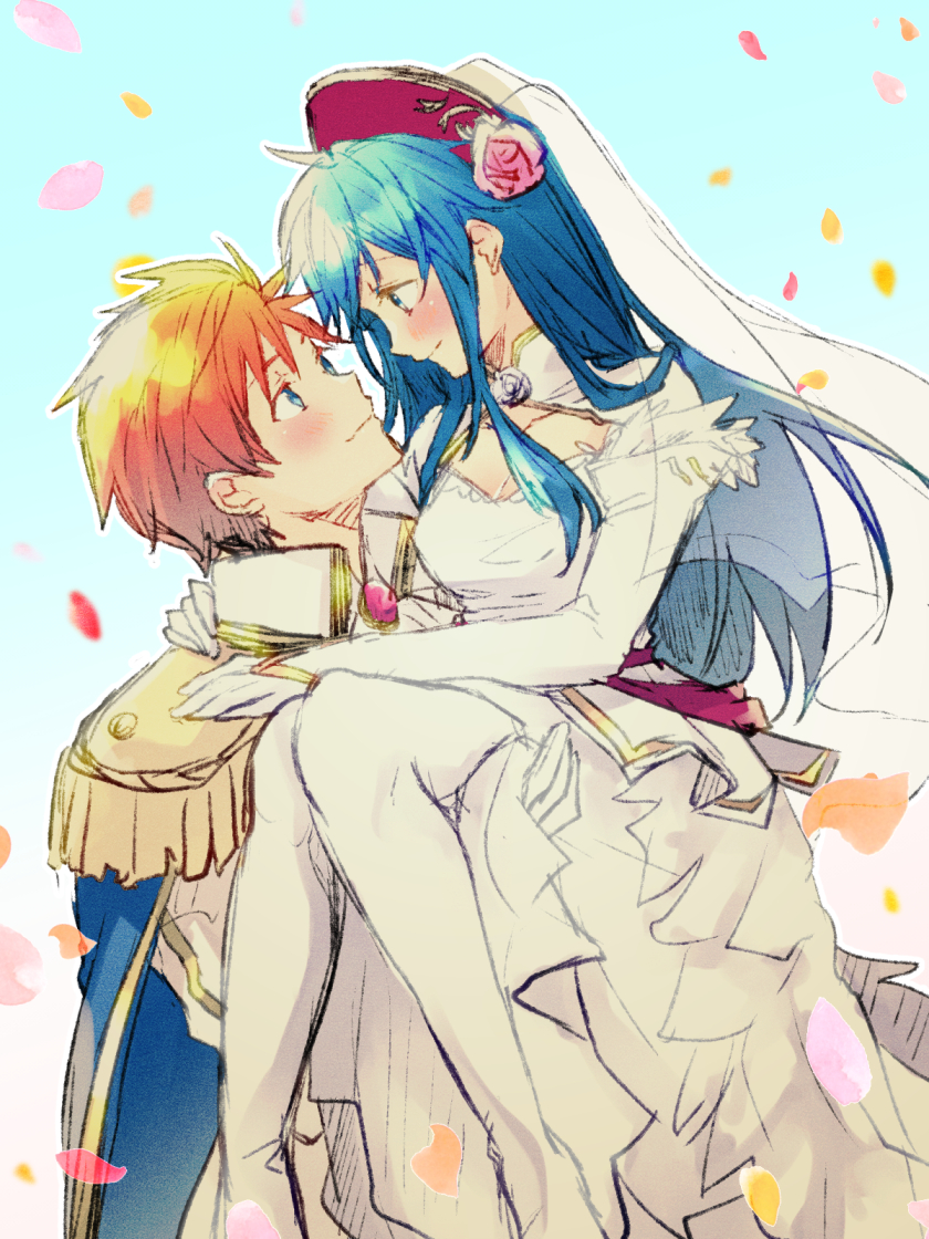 1boy 1girl arms_around_neck blue_cape blue_eyes blue_hair breasts bridal_veil bride cape carrying carrying_person closed_mouth commentary_request couple dress elbow_gloves epaulettes eye_contact falling_petals fire_emblem fire_emblem:_the_binding_blade fire_emblem_heroes flower gem gloves hair_flower hair_ornament hetero husband_and_wife lilina_(bridal)_(fire_emblem) lilina_(fire_emblem) long_hair looking_at_another medium_breasts nintendo nishimura_(shinchinagachi) official_alternate_costume petals princess_carry red_hair roy_(fire_emblem) roy_(groom)_(fire_emblem) short_hair smile thighhighs veil wedding wedding_dress white_dress white_gloves white_thighhighs