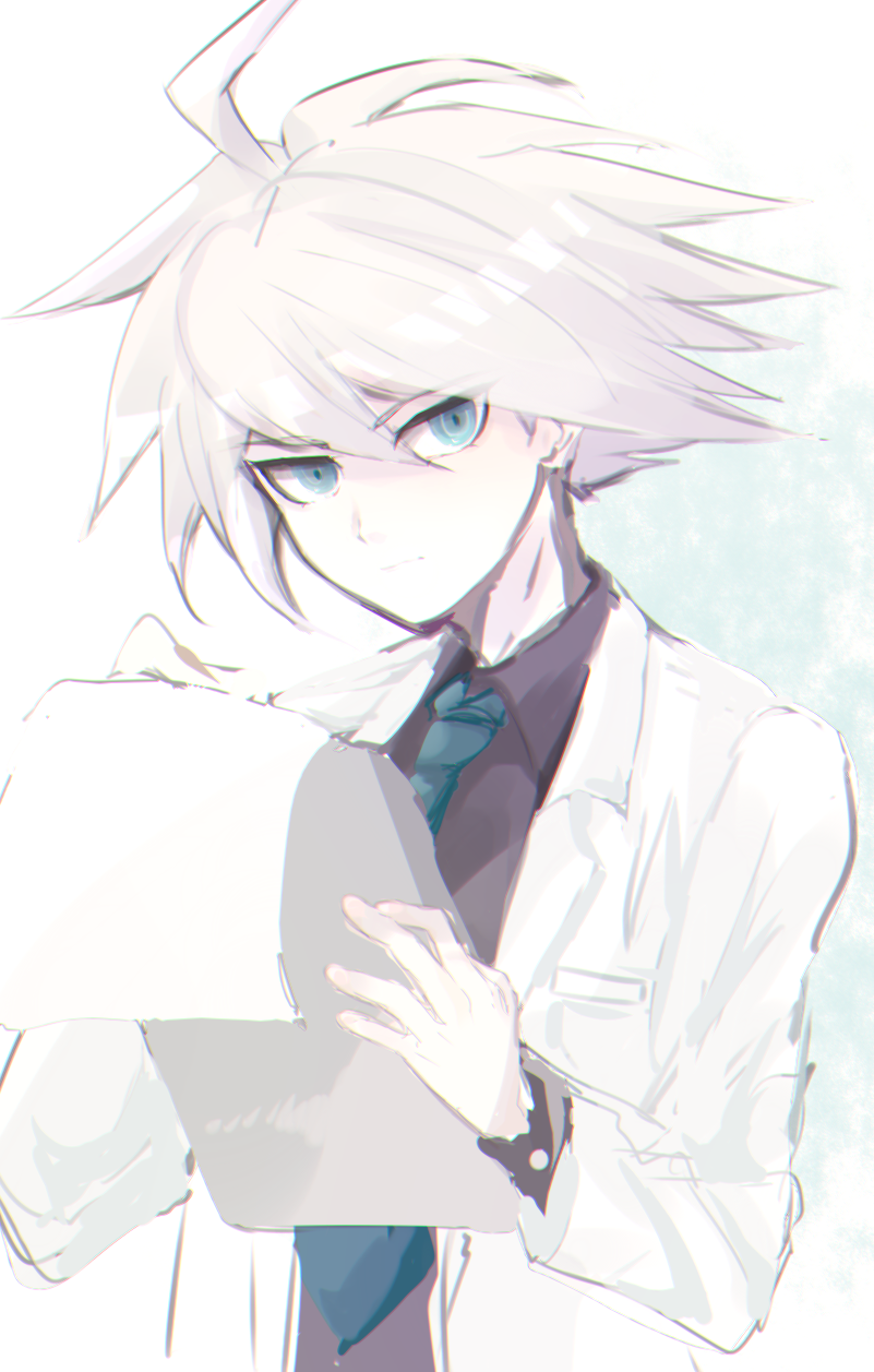 1boy ahoge blue_eyes blue_necktie clipboard commentary_request danganronpa_(series) danganronpa_v3:_killing_harmony harunotano highres looking_at_viewer male_focus necktie original professor_iidabashi short_hair simple_background solo upper_body white_background white_hair