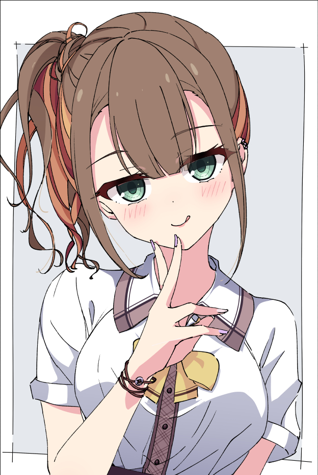 1girl :q blunt_bangs blush border bow bowtie breasts brown_hair center-flap_bangs closed_mouth collared_shirt commentary green_eyes grey_background gyaru hand_up head_tilt high_side_ponytail kogal looking_at_viewer medium_breasts medium_hair multicolored_hair nail_polish necktie okaeru orange_hair purple_necktie school_uniform seductive_smile shiraishi_chika shirt short_sleeves side_ponytail sidelocks simple_background smile solo tenshi_souzou_re-boot! tongue tongue_out tsurime two-tone_hair upper_body white_border white_shirt yellow_bow yellow_bowtie