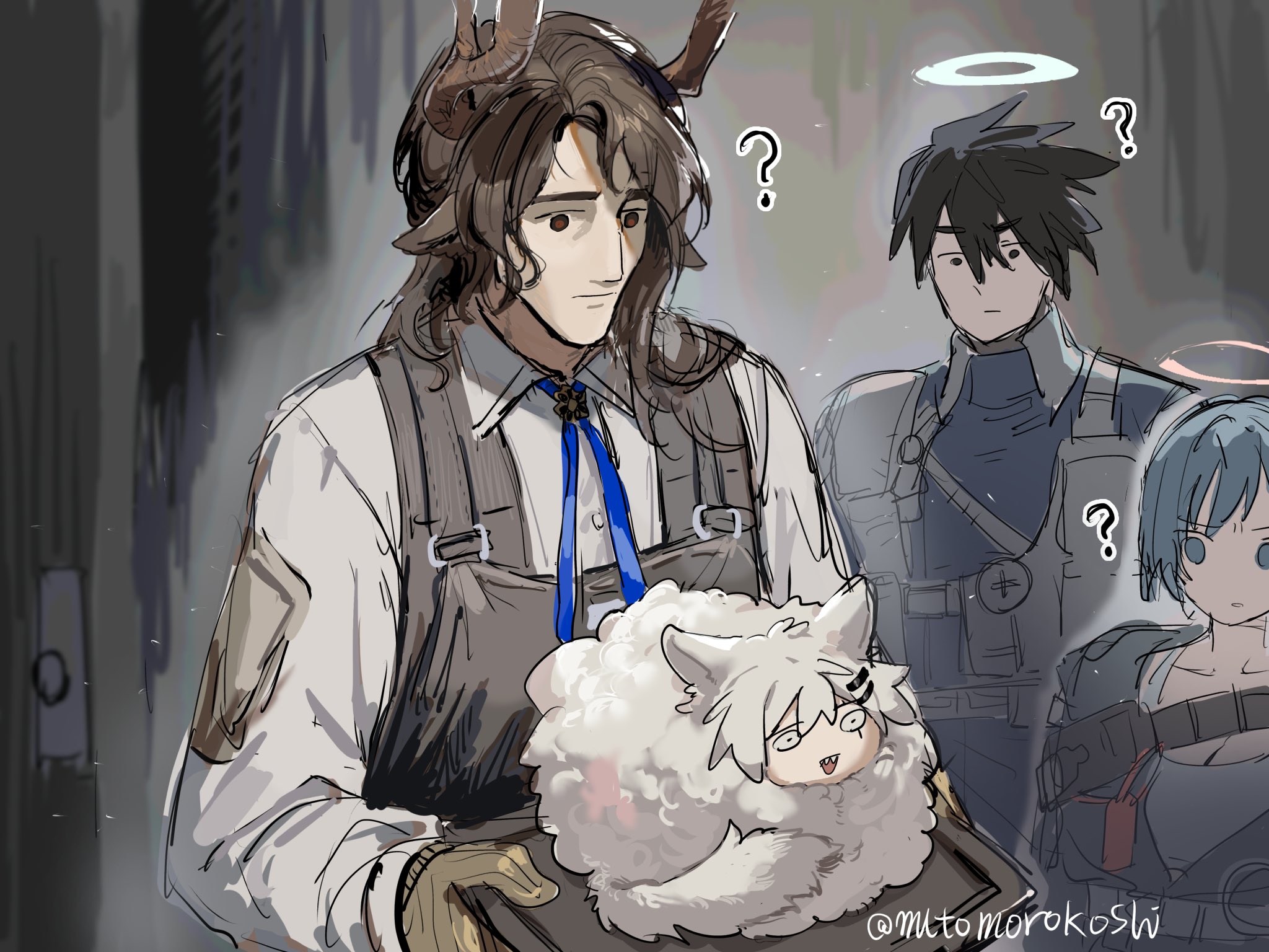 1girl 2boys antlers black_hair blue_hair clement_dubois_(arknights) deer_antlers deer_boy halo highres horns insider_(arknights) lappland_(arknights) long_sleeves multiple_boys mutomorokoshi short_hair spuria_(arknights) twitter_username upper_body