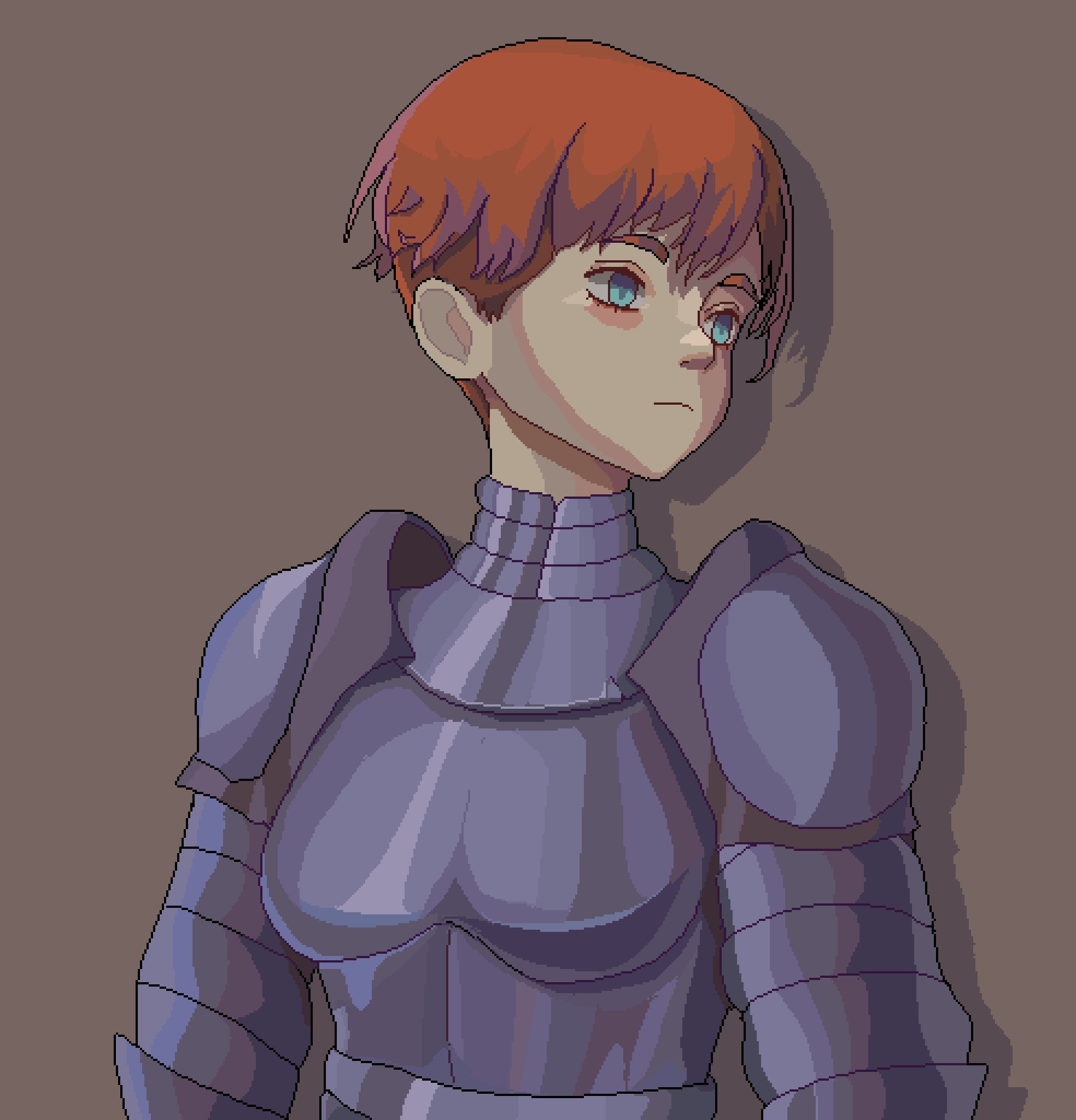 1girl armor blue_eyes boobplate breastplate brown_background closed_mouth commentary d'arce_(fear_&_hunger) fear_&_hunger_(series) fear_&_hunger_1 gipost gorget highres knight looking_to_the_side orange_hair pauldrons pixel_art shadow short_hair shoulder_armor simple_background solo upper_body