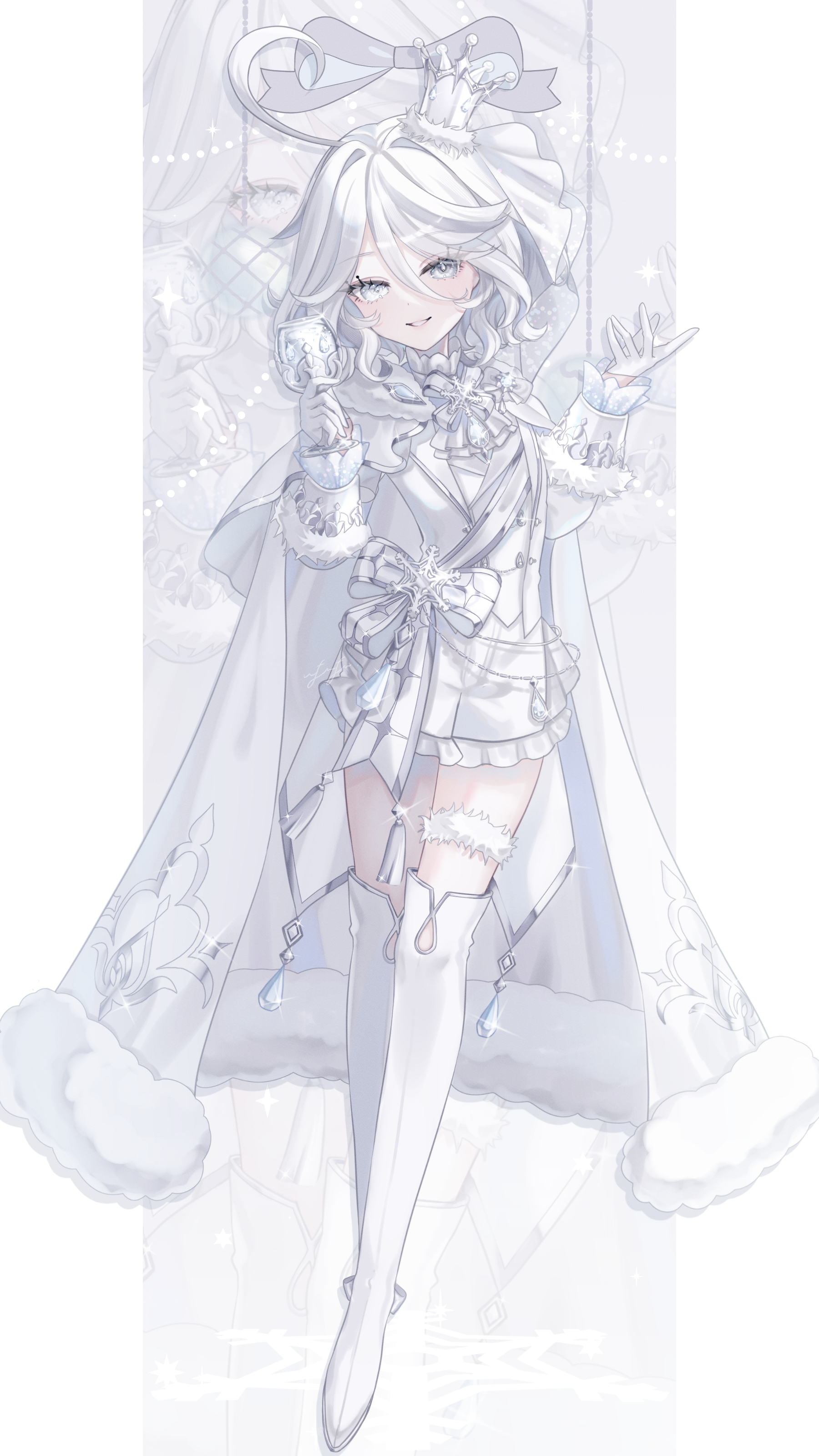 1girl absurdres adapted_costume ahoge alternate_color anninufufu ascot blush boots cape commentary crown cup drinking_glass furina_(genshin_impact) gem genshin_impact gloves grey_eyes grey_pupils hair_between_eyes hand_up highres holding holding_cup jacket long_sleeves looking_at_viewer medium_hair mini_crown ouji_fashion parted_lips smile untranslatable_commentary thigh_boots thigh_strap white_ascot white_cape white_footwear white_gem white_gloves white_hair white_jacket white_theme wine_glass zoom_layer