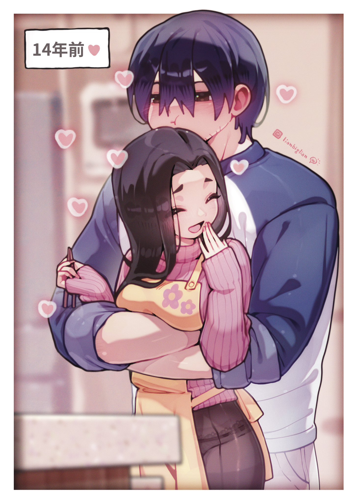 1boy 1girl apron blush boku_no_kokoro_no_yabai_yatsu character_request closed_eyes heart highres hug lianbiglian long_sleeves open_mouth sweater yamada_sanae_(bokuyaba) yamada_yuuki_(bokuyaba)
