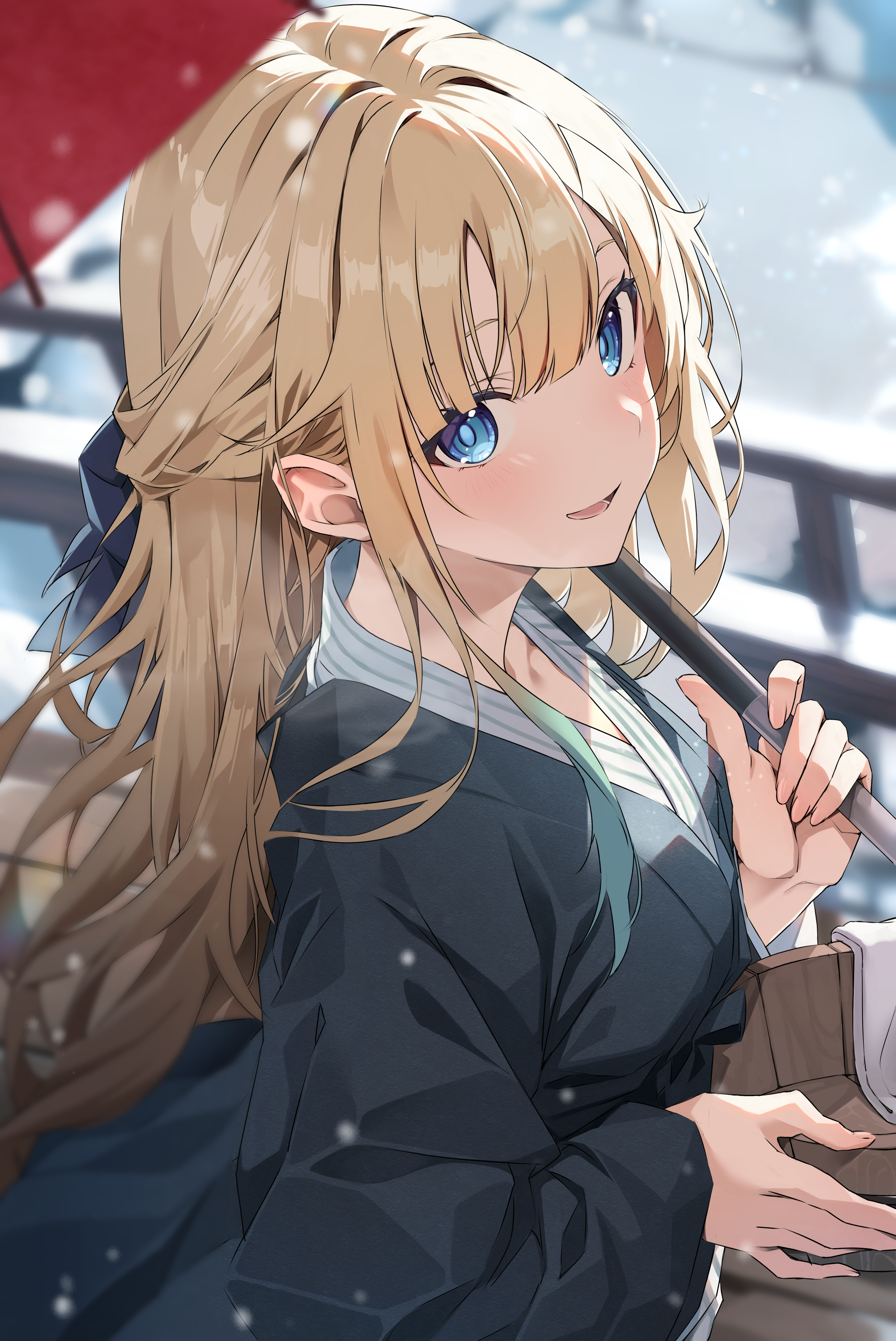 1girl absurdres aizawa_ema bathtub blonde_hair blue_eyes blunt_bangs blush breasts bucket commentary_request gradient_hair hair_between_eyes hair_intakes hair_ribbon half_updo highres holding holding_bucket holding_umbrella japanese_clothes kimono large_breasts long_hair looking_at_viewer multicolored_hair ribbon ruo19 smile snow snowing solo umbrella virtual_youtuber vspo! wooden_bucket