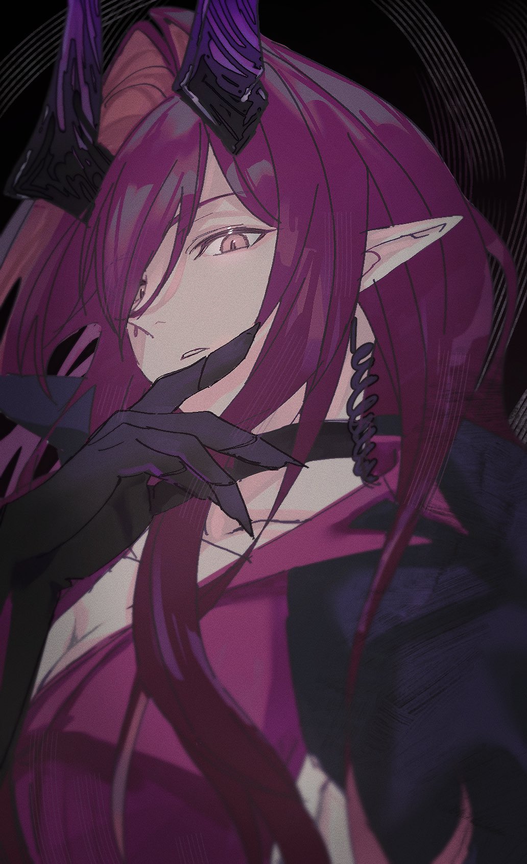 1girl arknights ascalon_(arknights) black_background black_choker black_gloves black_horns breasts choker cleavage commentary_request facial_mark gloves highres horns konota_ko long_hair looking_at_viewer multicolored_horns pink_eyes pointy_ears purple_hair purple_horns purple_shirt shirt simple_background solo teardrop_facial_mark upper_body white_background