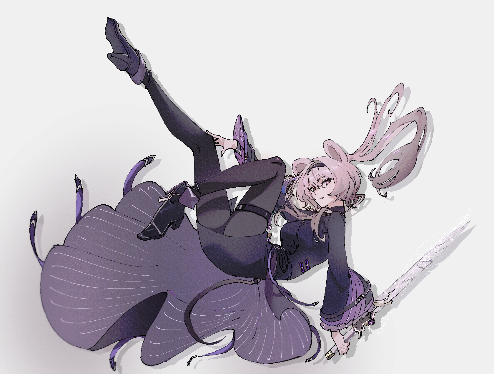 1girl animal_ears arknights black_dress black_footwear black_hairband black_pantyhose breasts brown_eyes commentary_request dress floating full_body grey_background hair_between_eyes hairband high_heels highres holding holding_sword holding_weapon konota_ko lin_(arknights) long_hair long_sleeves looking_at_viewer medium_breasts mouse_ears mouse_girl mouse_tail odaibako open_mouth pantyhose pink_hair simple_background solo sword tail weapon