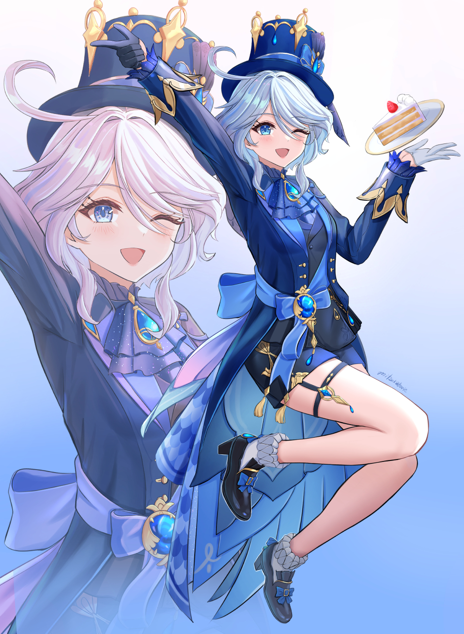 1girl ahoge ascot black_footwear black_gloves black_shorts blue_eyes blue_hair blue_jacket blush cake food full_body furina_(genshin_impact) genshin_impact gloves hair_between_eyes hat heterochromia high_heels highres jacket light_blue_hair long_hair long_sleeves looking_at_viewer mitsukayurie multicolored_hair multiple_views one_eye_closed open_mouth plate shorts smile streaked_hair symbol-shaped_pupils top_hat upper_body vision_(genshin_impact) white_hair zoom_layer