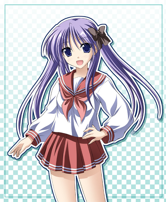 00s 1girl :d bow female_focus hair_bow hiiragi_kagami long_sleeves looking_at_viewer lucky_star neckerchief open_mouth pink_neckerchief pleated_skirt purple_eyes purple_hair red_skirt school_uniform serafuku shirt skirt smile solo tsuda_akira white_shirt