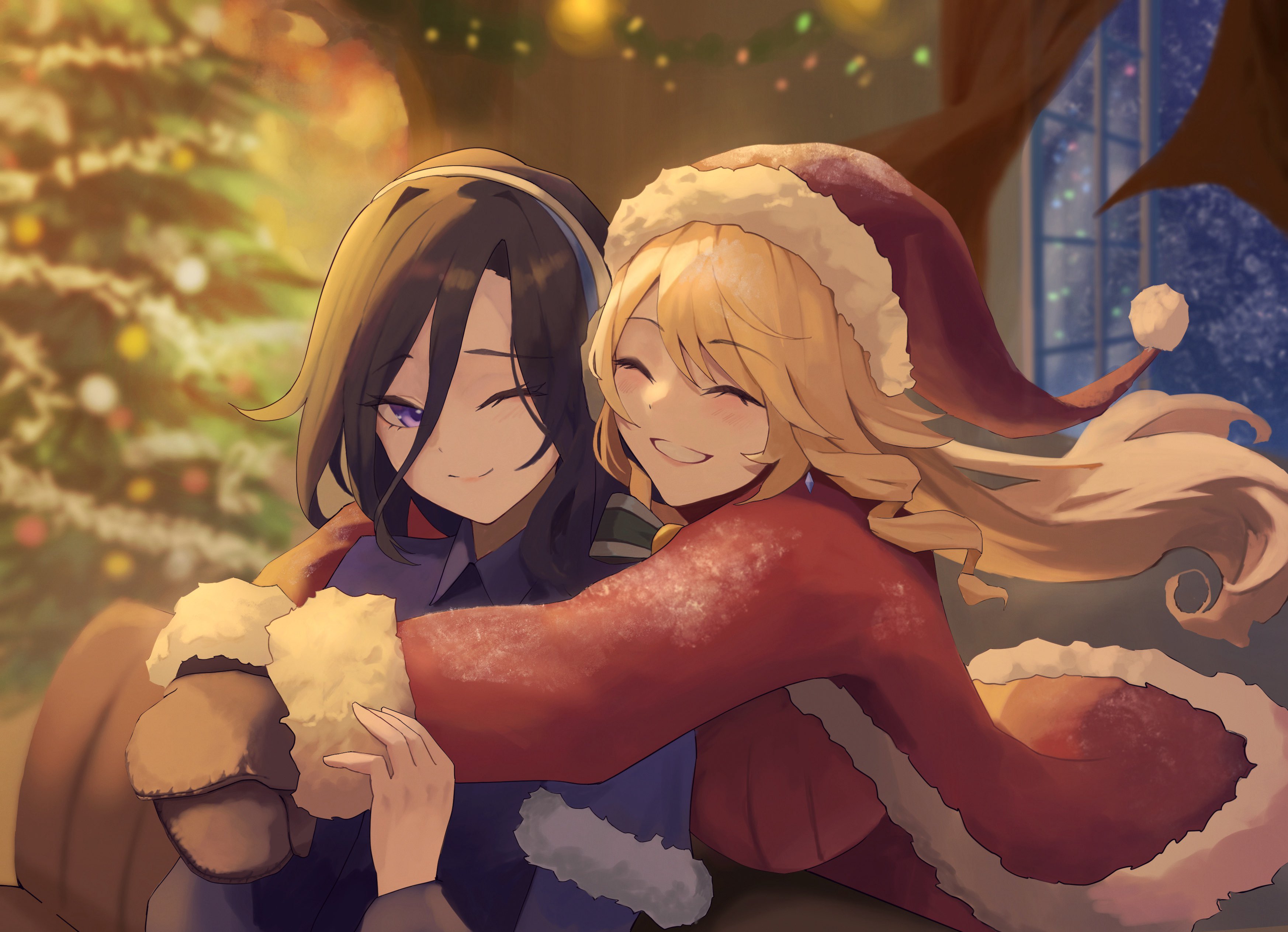 2girls absurdres black_hair blurry blurry_background breasts brown_mittens christmas_lights christmas_tree clorinde_(genshin_impact) closed_eyes collared_shirt couch drill_hair drill_sidelocks earrings genshin_impact grin hair_between_eyes hair_lift haruhachiya hashtag-only_commentary hat highres hug hug_from_behind jewelry large_breasts long_hair long_hair_between_eyes mittens multiple_girls navia_(genshin_impact) night one_eye_closed open_window purple_eyes purple_shirt santa_costume santa_hat shirt sidelocks sitting sky smile window yuri