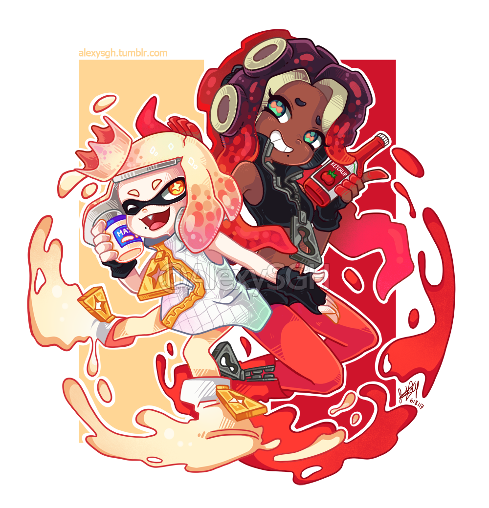 +_+ 2girls cephalopod_eyes commentary crop_top cropped_vest crown dark-skinned_female dark_skin english_commentary fingerless_gloves full_body gloves gradient_hair green_eyes headphones horizontal_pupils inkling ketchup ketchup_bottle long_hair looking_at_viewer marina_(off_the_hook_outfit)_(splatoon) marina_(splatoon) mayonnaise mayonnaise_bottle mole mole_under_mouth multicolored_hair multiple_girls navel_piercing nintendo octoling open_mouth pearl_(off_the_hook_outfit)_(splatoon) pearl_(splatoon) piercing pink_hair pink_pupils sandragh short_hair signature simple_background smile splatoon_(series) splatoon_2 suction_cups symbol-shaped_pupils teeth tentacle_hair very_dark_skin vest watermark white_hair yellow_eyes zipper_pull_tab