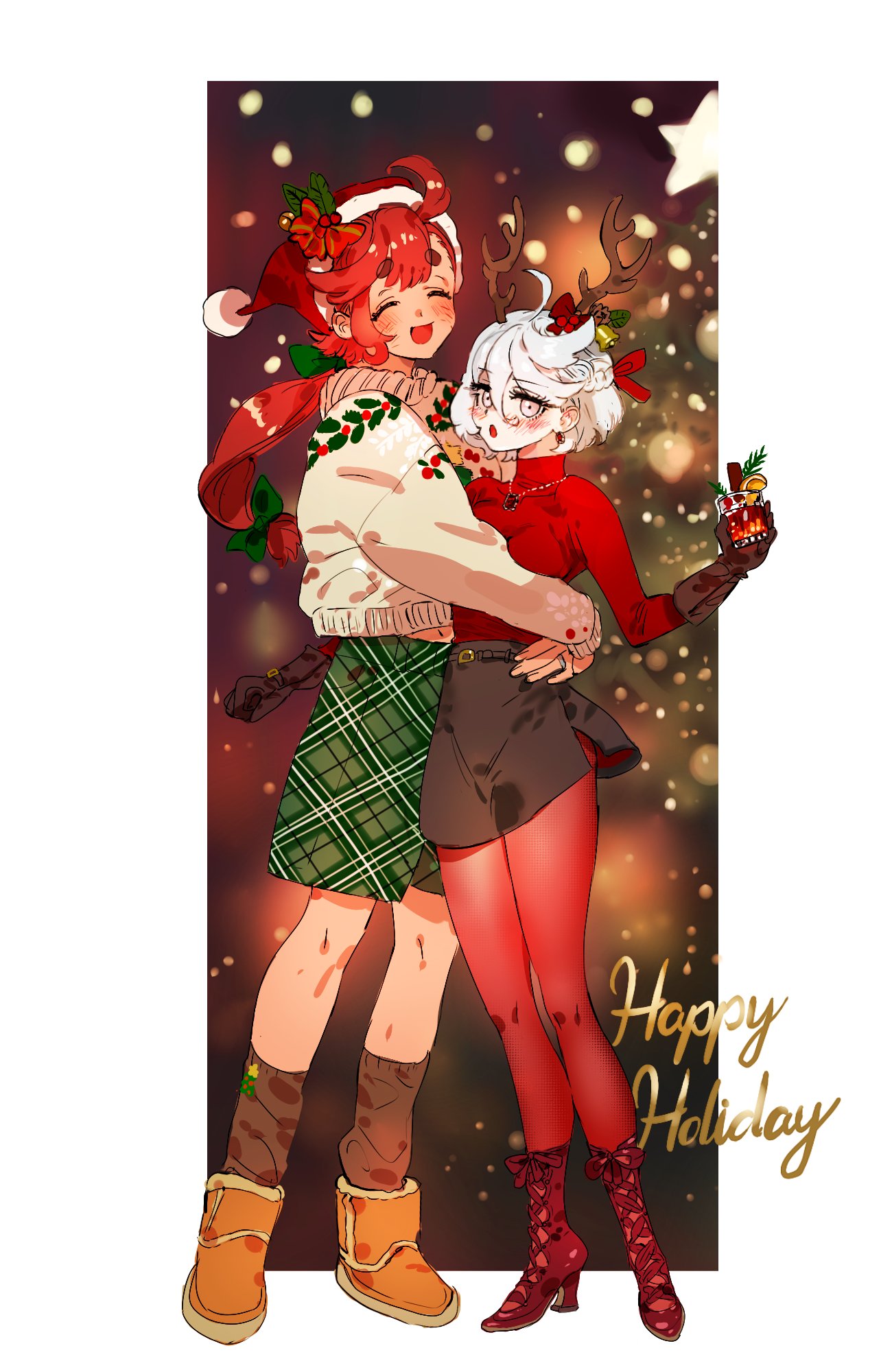 2girls belletaku black_skirt blurry brown_gloves christmas christmas_tree depth_of_field english_text female_focus full_body gloves green_skirt gundam gundam_suisei_no_majo happy_holidays hat height_difference highres hug jewelry long_hair miorine_rembran multiple_girls pantyhose plaid_clothes plaid_skirt red_hair red_pantyhose red_sweater ring santa_hat sketch skirt suletta_mercury sweater wedding_ring white_background white_hair wife_and_wife yuri