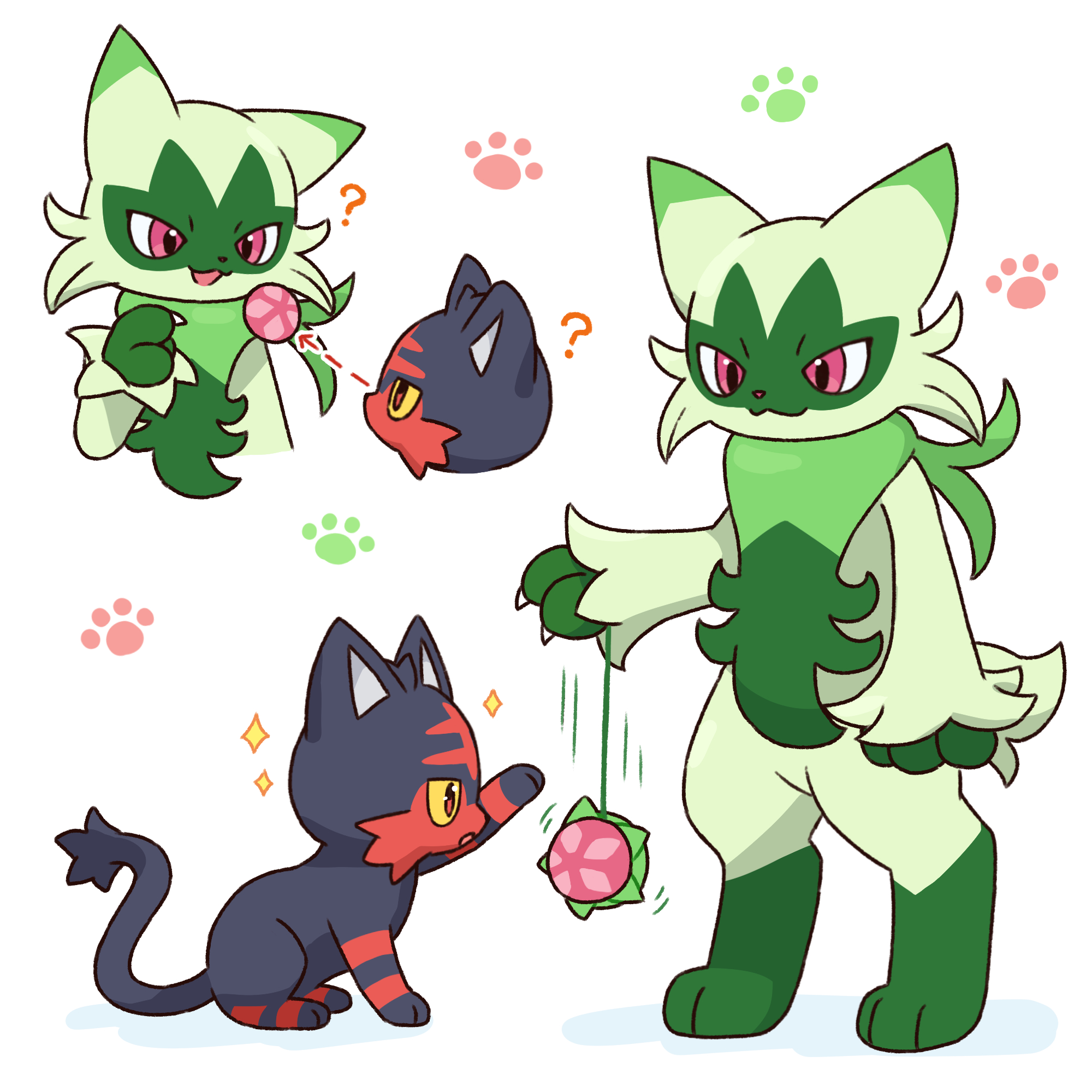 1other claws colored_sclera floragato full_body furry gen_7_pokemon highres litten neko_gyoza nintendo paw_print pink_eyes pokemon pokemon_(creature) red_eyes scarf smile standing tail yellow_sclera yo-yo
