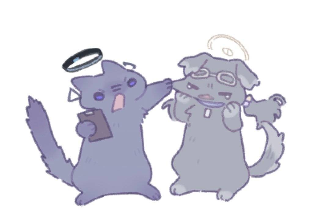 2girls angry animal animal_ears animalization black_halo blue_archive blue_eyes blue_hair cat cat_ears cat_girl cat_tail cheek_pinching cheek_pull clipboard collar commentary_request dog dog_ears dog_girl dog_tail eyewear_on_head goggles goggles_on_head grey_hair hair_bobbles hair_ornament halo hibiki_(blue_archive) holding holding_clipboard korean_commentary mechanical_halo multiple_girls nagakiras2 open_mouth pinching simple_background tail tears twintails white_background yellow_halo yuuka_(blue_archive)