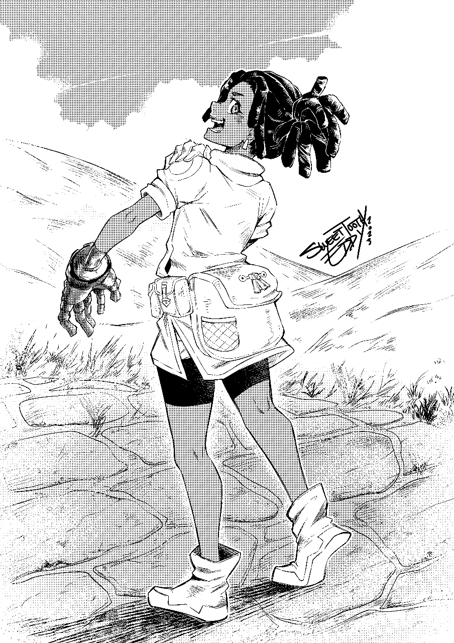 1girl bag belt_bag belt_pouch boots brick_road cast_(clock_striker) clock_striker cloud cloudy_sky commentary dark-skinned_female dark_skin dated dreadlocks earrings english_commentary from_behind full_body gloves grass greyscale halftone highres jacket jewelry looking_back mechanical_hands monochrome open_mouth outdoors ponytail pouch shorts signature single_glove single_mechanical_hand sky smile solo standing sweet_tooth_eddy