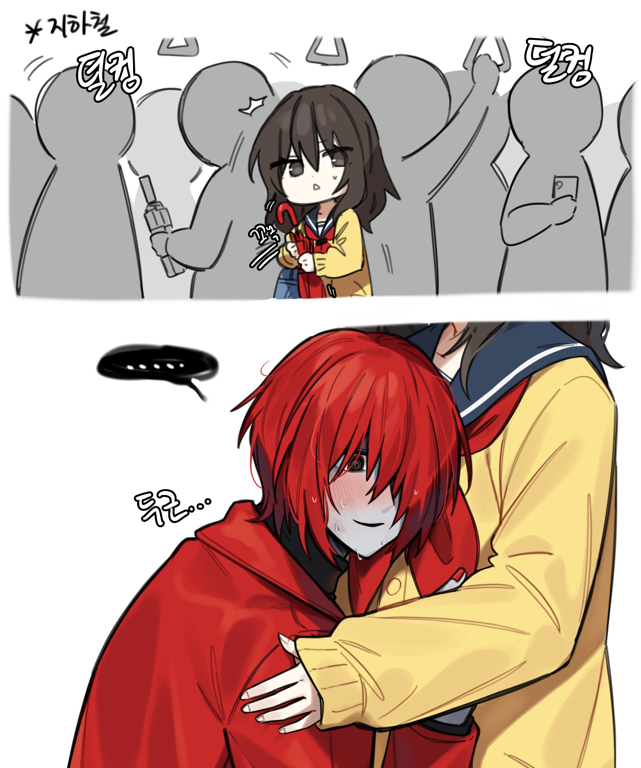 ... 1boy 1girl absurdres blue_serafuku blush brown_eyes brown_hair cardigan coat commentary_request dilated_pupils adashino_adami hetero highres holding holding_umbrella homicipher hug korean_commentary korean_text long_hair mr._scarletella myam_(123ab456c) people red_coat red_eyes red_hair red_umbrella school_uniform serafuku short_hair spoken_ellipsis train_interior translation_request umbrella yellow_cardigan