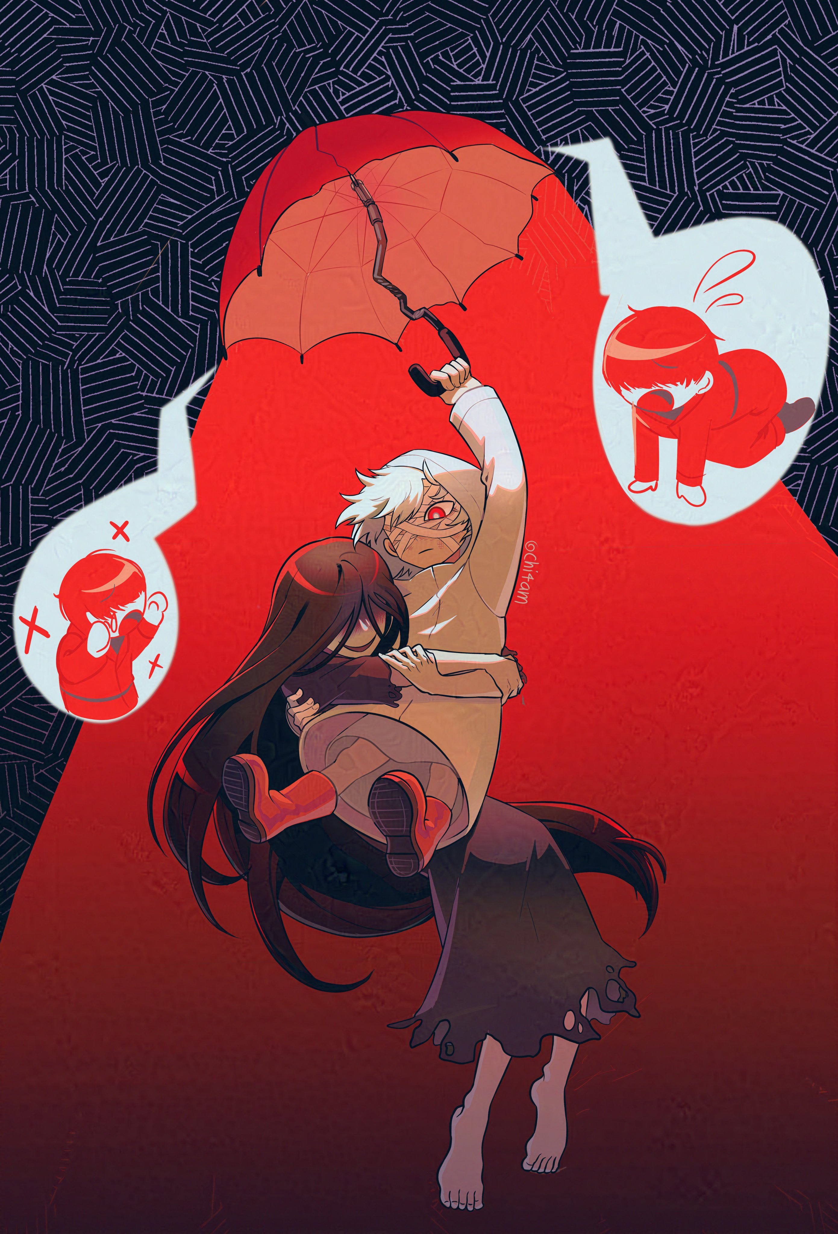 1girl 2boys absurdres bandage_over_one_eye black_hair black_kimono chi4am coat flying full_body adashino_adami highres holding holding_umbrella homicipher japanese_clothes kimono long_hair looking_at_another mr._crawling mr._scarletella multiple_boys raincoat red_background red_coat red_eyes red_hair short_hair umbrella very_long_hair white_raincoat
