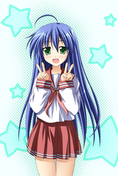 00s 1girl :d ahoge blue_hair blush double_v female_focus green_eyes izumi_konata long_hair long_sleeves lucky_star mole mole_under_eye open_mouth pleated_skirt red_skirt school_uniform serafuku skirt smile solo standing star_(symbol) thigh_gap tsuda_akira v very_long_hair