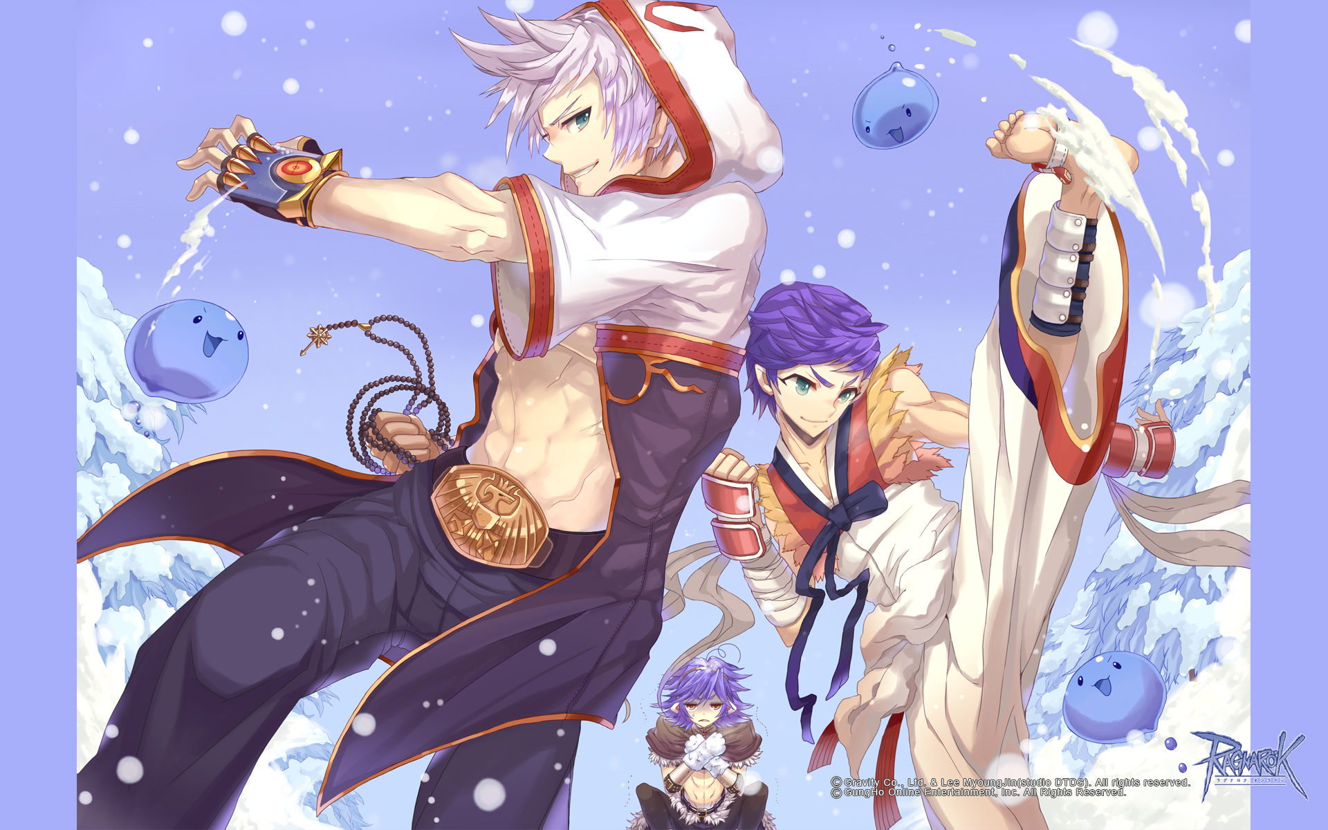 3boys abs arm_wrap barefoot beads belt black_bow black_bowtie black_coat black_gloves black_pants blue_background bow bowtie championship_belt clenched_hand closed_mouth coat copyright_notice feet_out_of_frame fingerless_gloves gloves gold_trim green_eyes grin guest_art highres hood hood_up hooded_coat kicking logo male_focus marin_(ragnarok_online) monk_(ragnarok_online) multicolored_coat multiple_boys muscular muscular_male official_art official_wallpaper open_clothes open_coat pants prayer_beads purple_hair q_qree ragnarok_online red_coat red_eyes shin_guards shirt short_bangs short_hair short_sleeves slime_(creature) smile snow stalker_(ragnarok_online) taekwon_(ragnarok_online) white_coat white_hair white_pants white_shirt