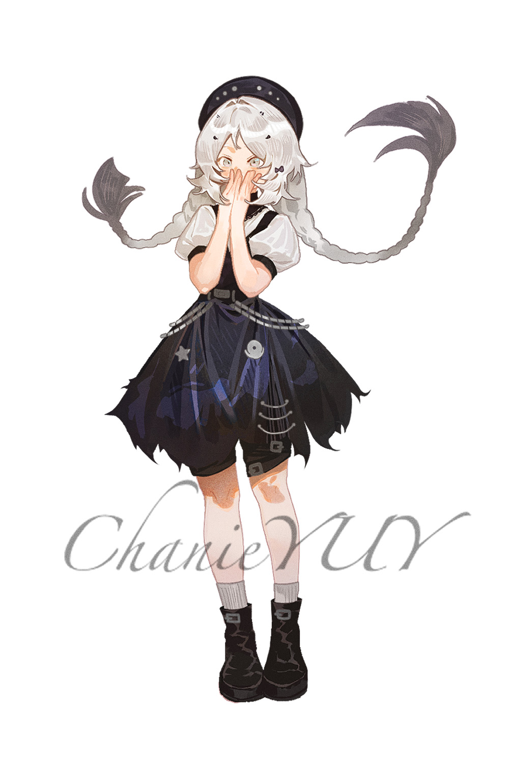 1girl ankle_boots artist_name balloon_party beret black_boots black_hat black_shorts black_skirt boots braid chanieyuy covering_own_mouth floating_hair full_body grey_eyes grey_hair hand_over_own_mouth hands_up hat highres long_hair looking_at_viewer low_twin_braids miniskirt puffy_short_sleeves puffy_sleeves reverse:1999 shirt short_sleeves shorts shorts_under_skirt skirt socks solo standing suspender_skirt suspenders twin_braids white_background white_shirt white_socks