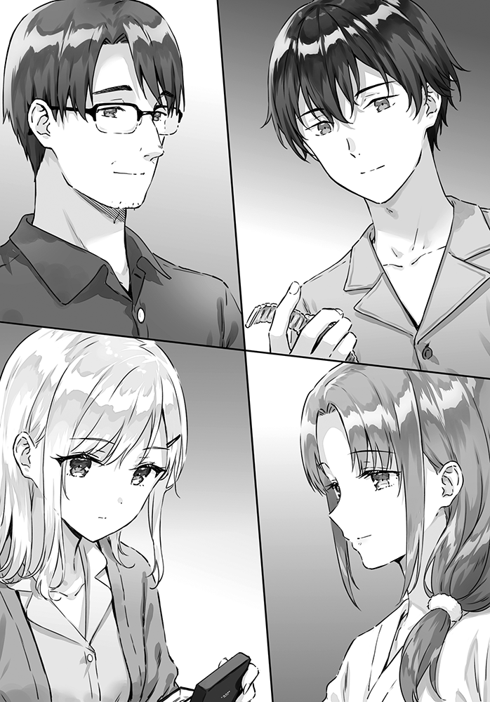 2boys 2girls asamura_taichi asamura_yuuta ayase_akiko ayase_saki beard_stubble closed_mouth collarbone collared_shirt commentary_request facial_hair family gimai_seikatsu glasses greyscale hair_ornament hairclip hiten_(hitenkei) holding long_hair monochrome multiple_boys multiple_girls novel_illustration official_art over-rim_eyewear second-party_source semi-rimless_eyewear shirt short_hair stubble