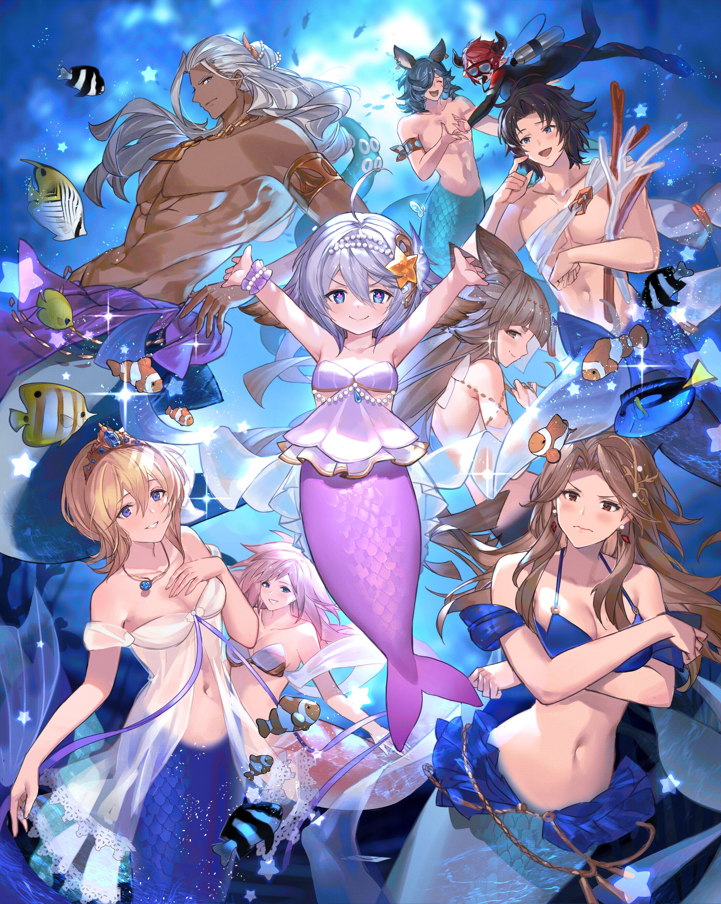 3boys 6+girls absurdres ahoge animal_ears bikini bikini_top_only black_hair blonde_hair blue_eyes blue_hair bracelet coral dark-skinned_male dark_skin drang_(granblue_fantasy) erune europa_(granblue_fantasy) fins fish gabriel_(granblue_fantasy) granblue_fantasy hair_between_eyes hair_ornament hands_up harvin highres horns jewelry katalina_(granblue_fantasy) lancelot_(granblue_fantasy) long_hair mermaid merman monster_boy monster_girl multiple_boys multiple_girls nishiki_(jinnishiki) open_mouth pholia pink_hair poseidon_(granblue_fantasy) red_hair scuba_gear short_hair star_(symbol) star_hair_ornament sturm_(granblue_fantasy) swimsuit tentacles tiara underwater wamdus_(granblue_fantasy) white_hair